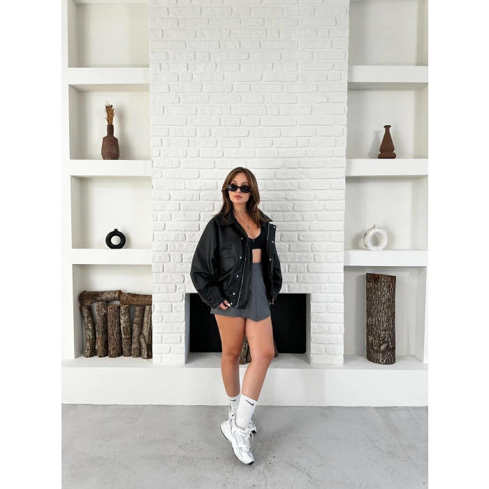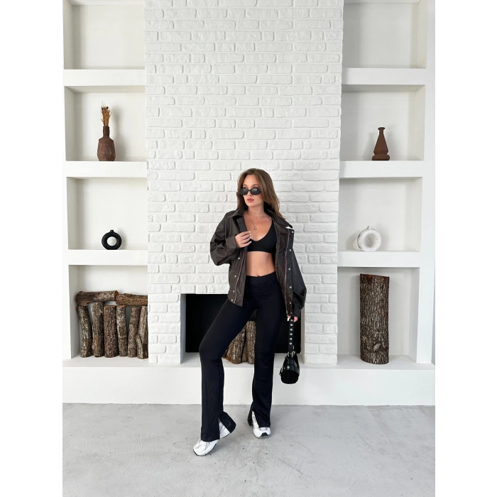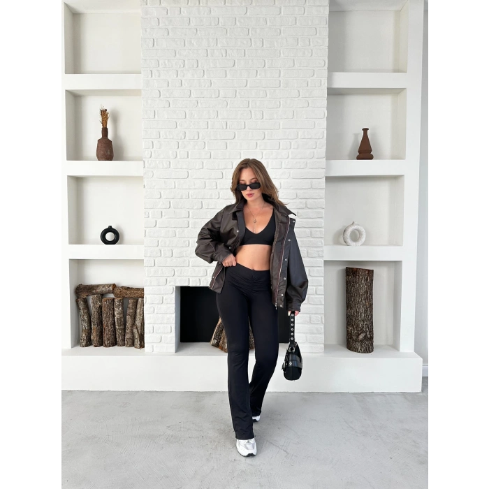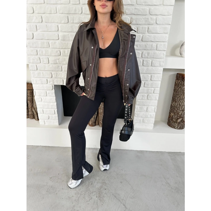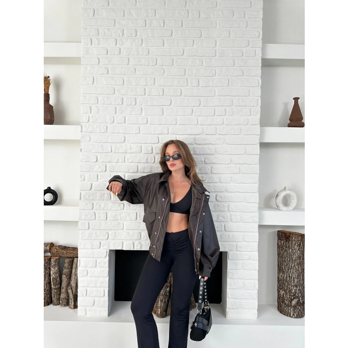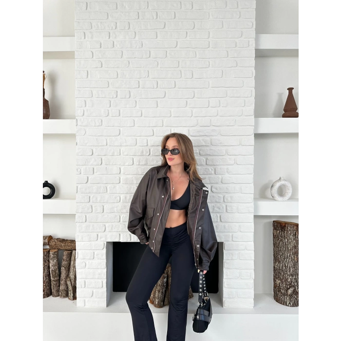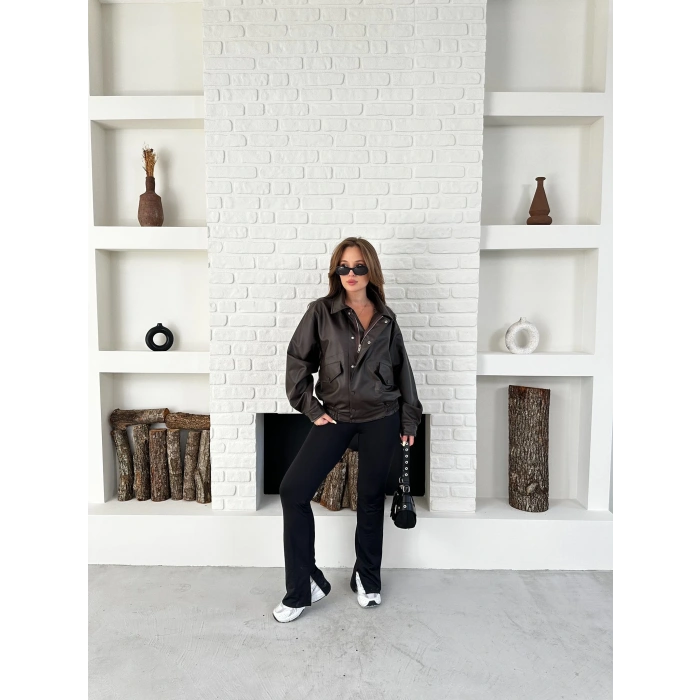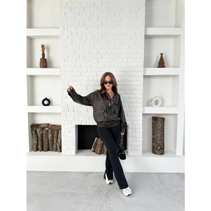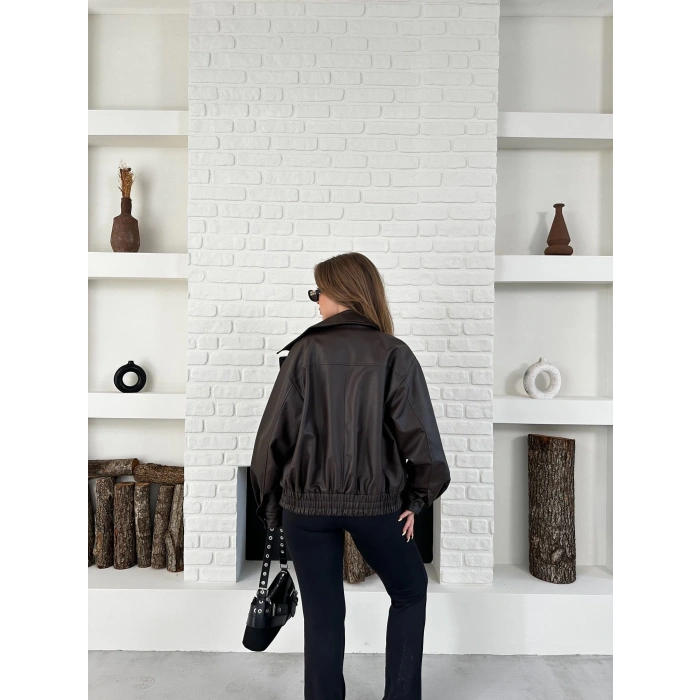 Çıtçıt Detaylı Tasarım Bomber Deri Ceket Kahverengi