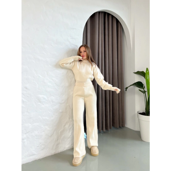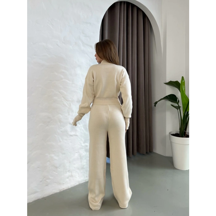 Dik Yaka Parmak Geçmeli Triko Takım Bej