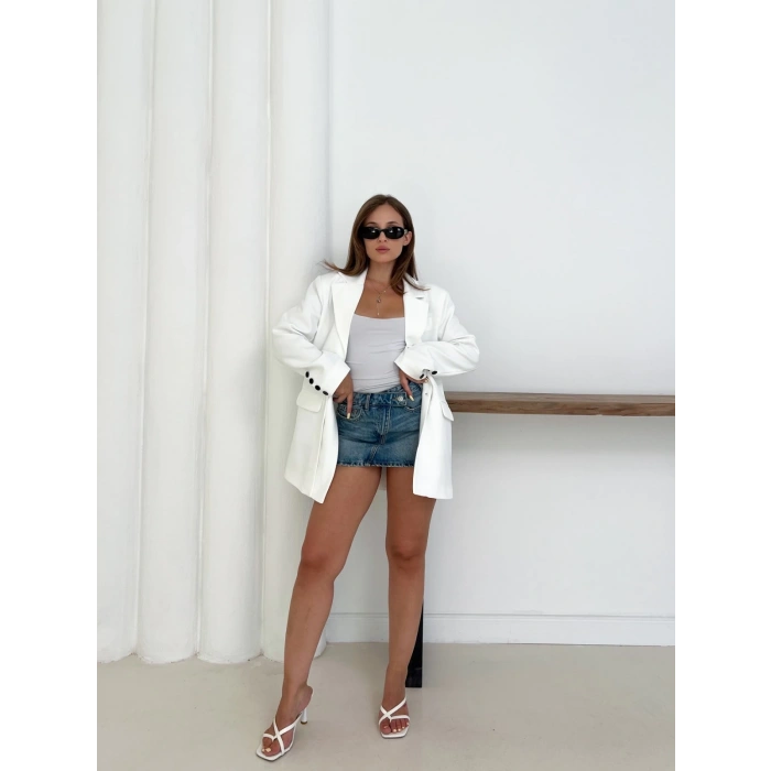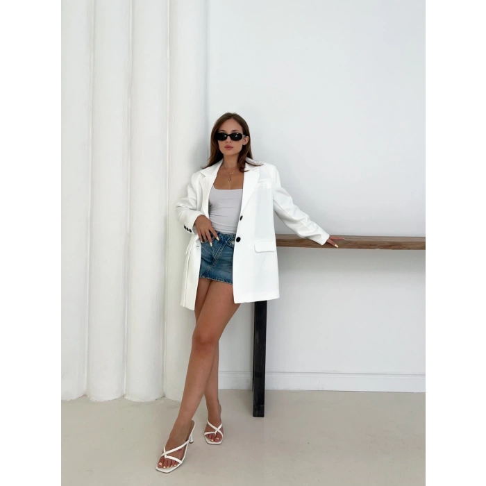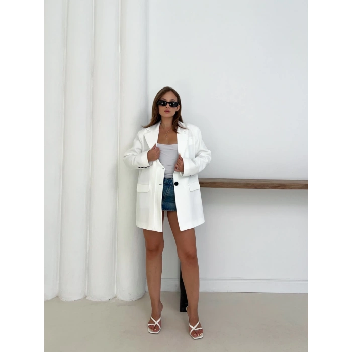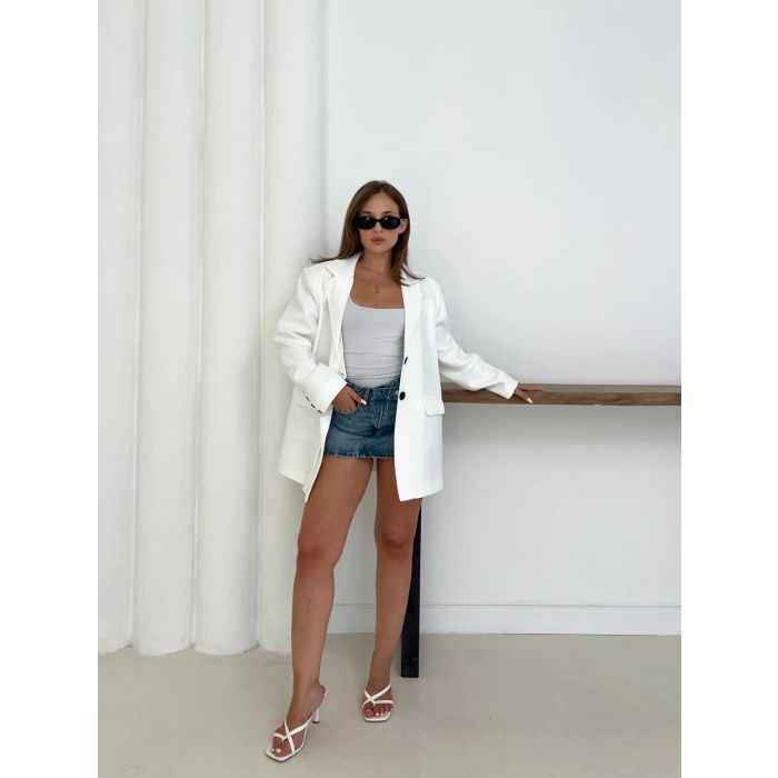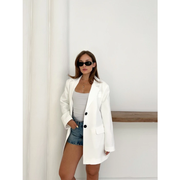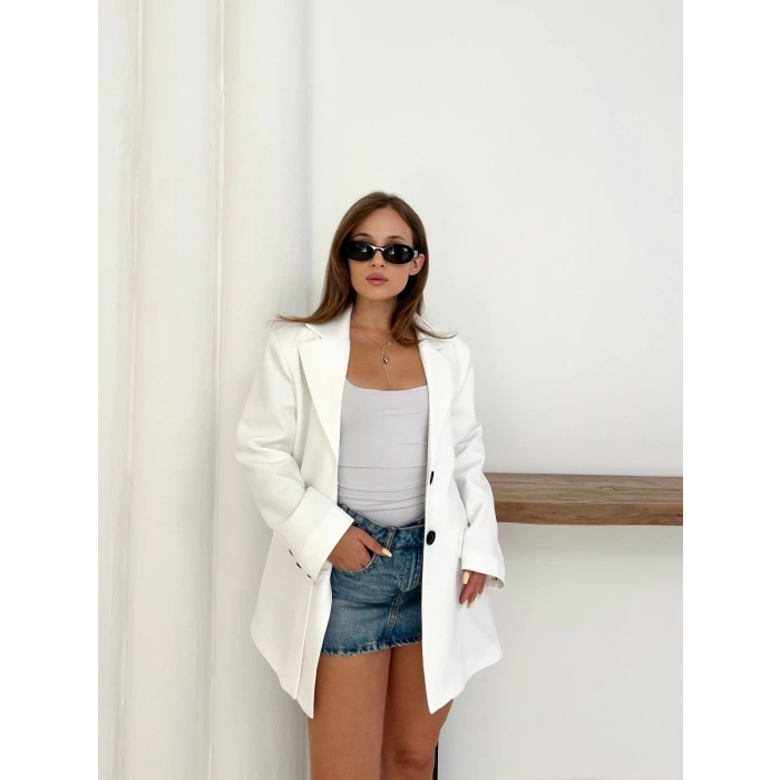 Düğme Detay Kruvaze Yaka Blazer Ceket Beyaz