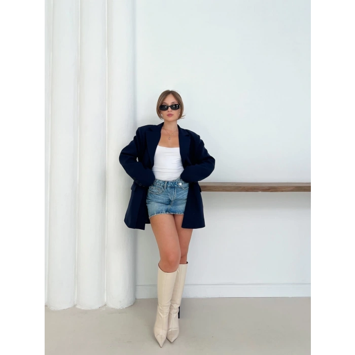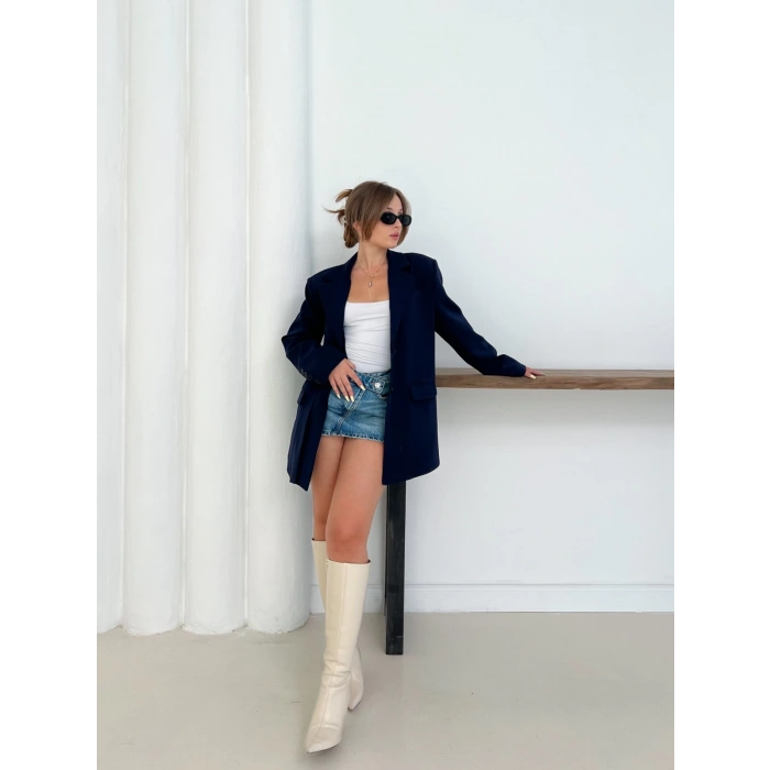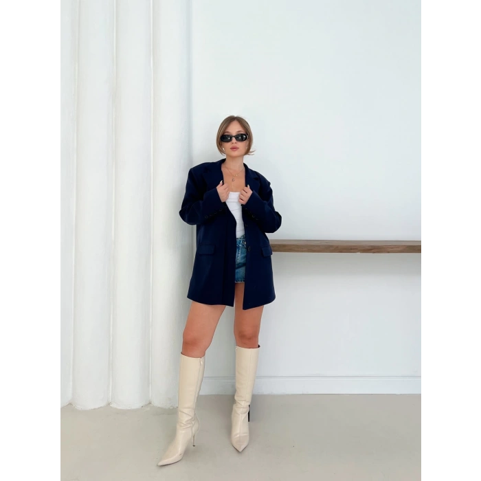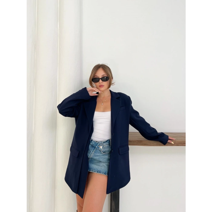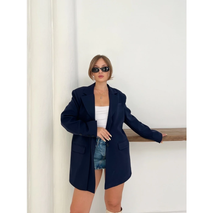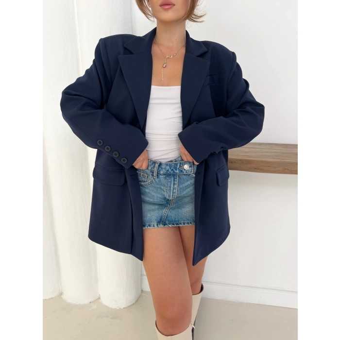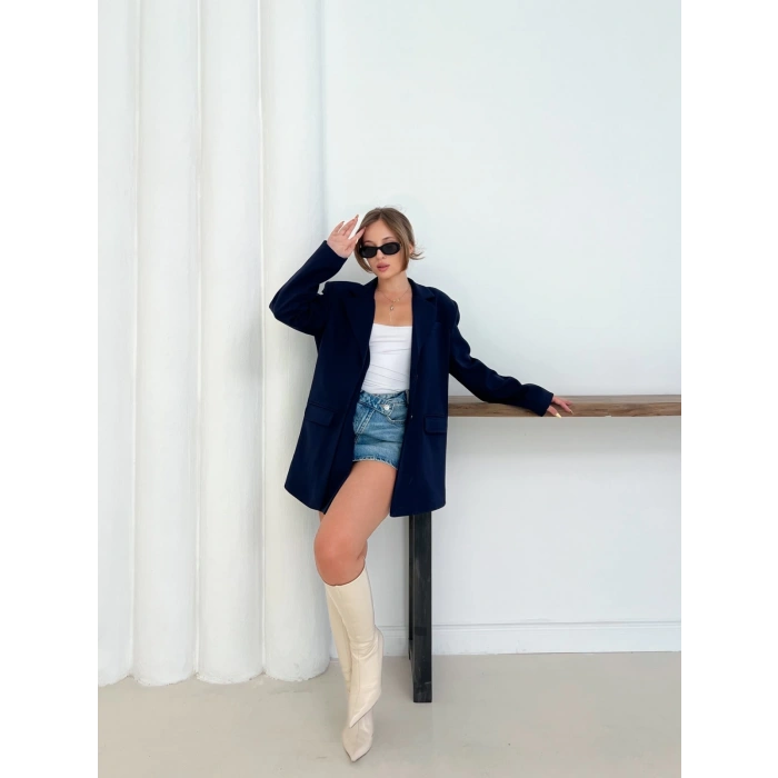 Düğme Detay Kruvaze Yaka Blazer Ceket Lacivert