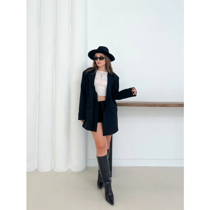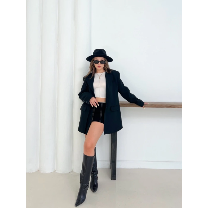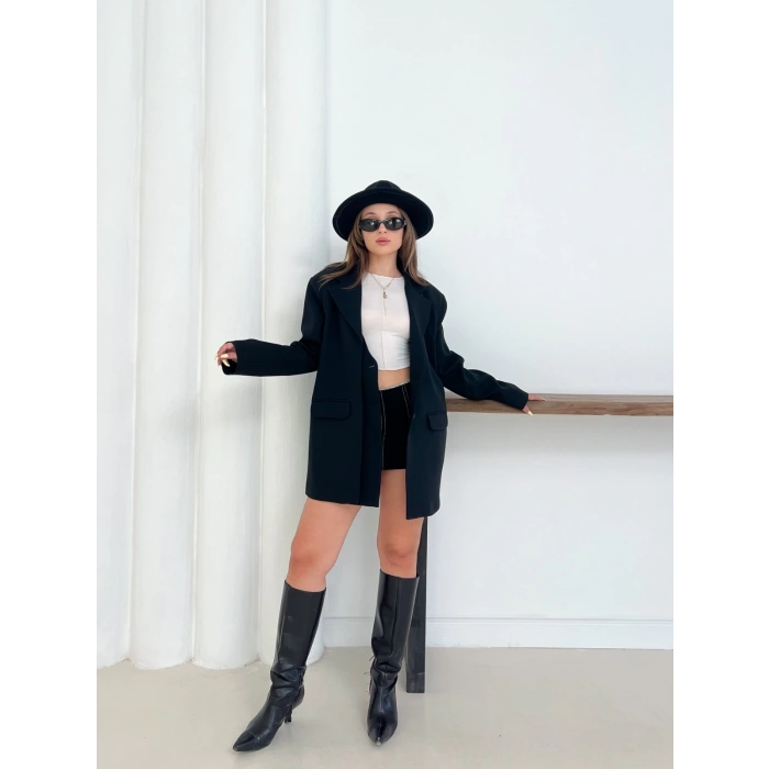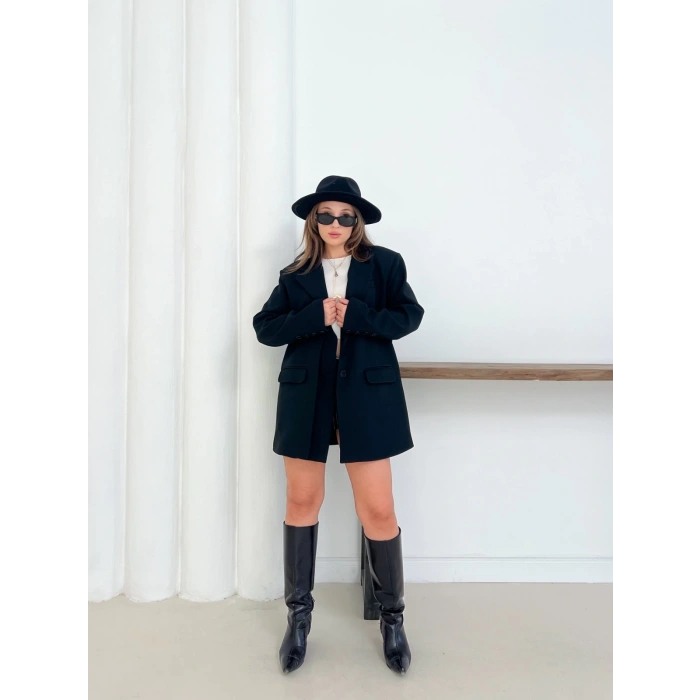 Düğme Detay Kruvaze Yaka Blazer Ceket Siyah
