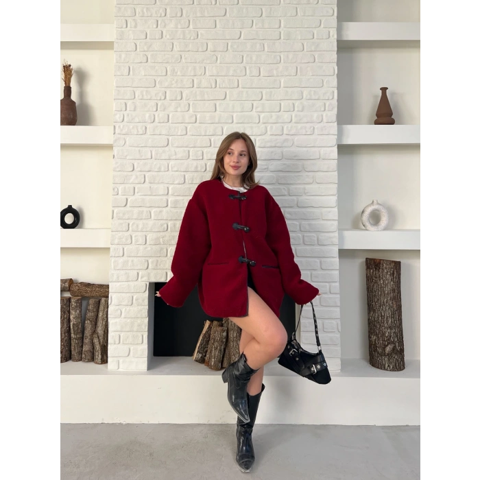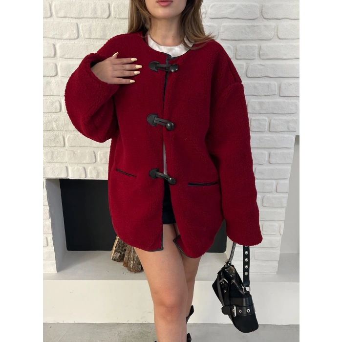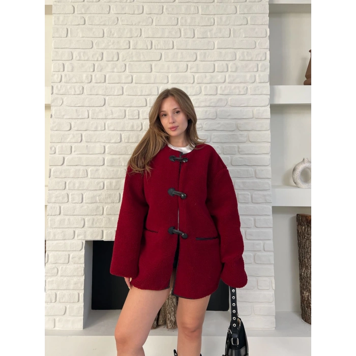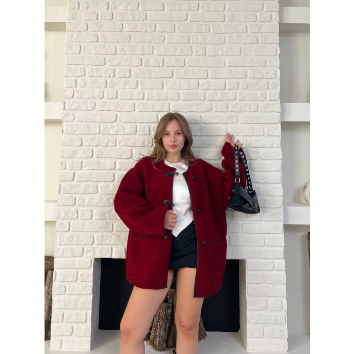 Düğme Detay Teddy Oversize Ceket Bordo