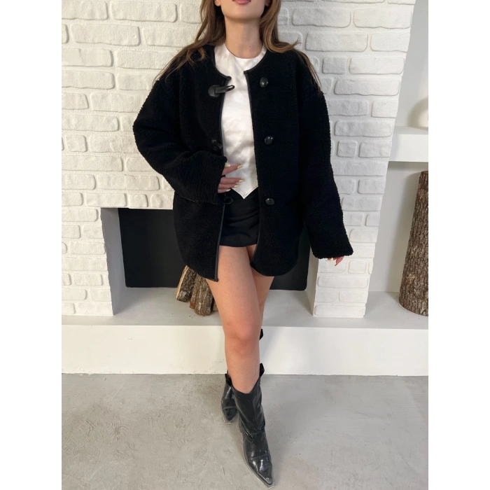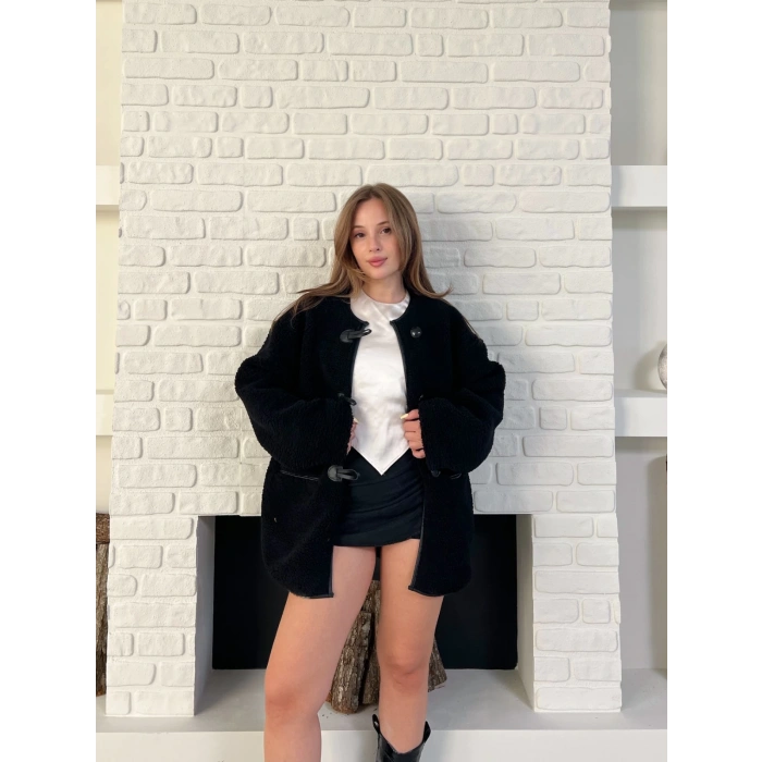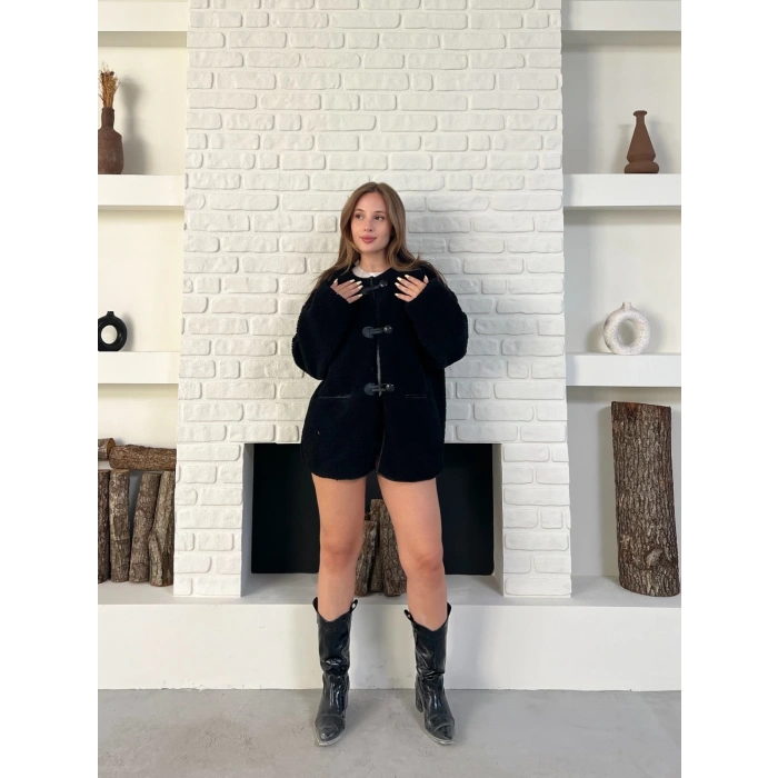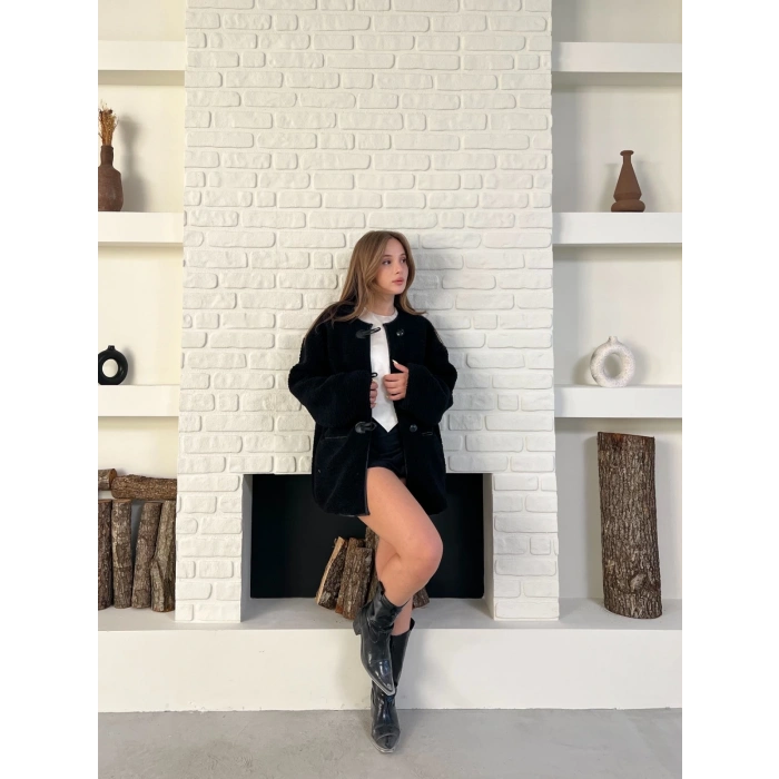 Düğme Detay Teddy Oversize Ceket Siyah