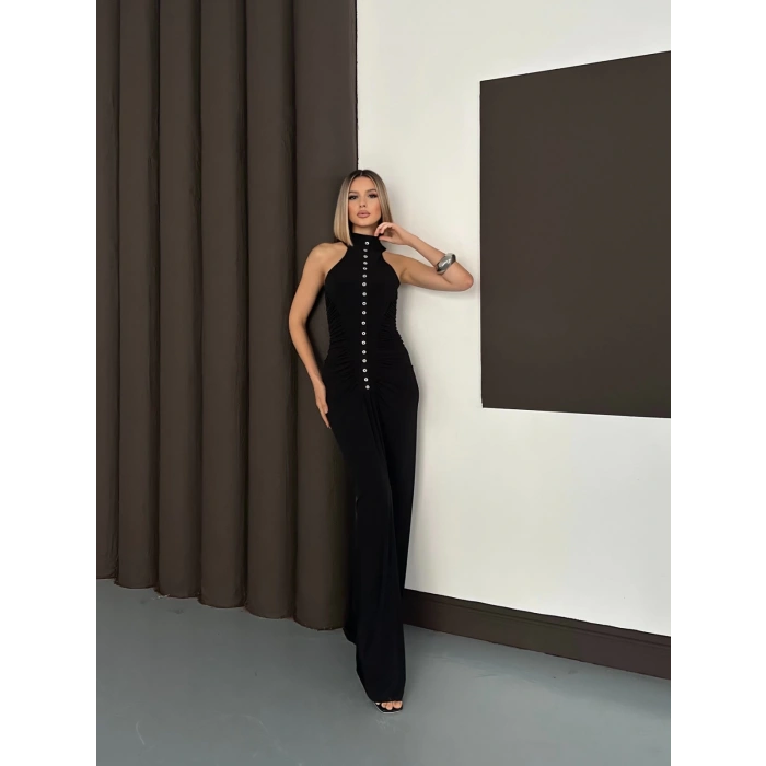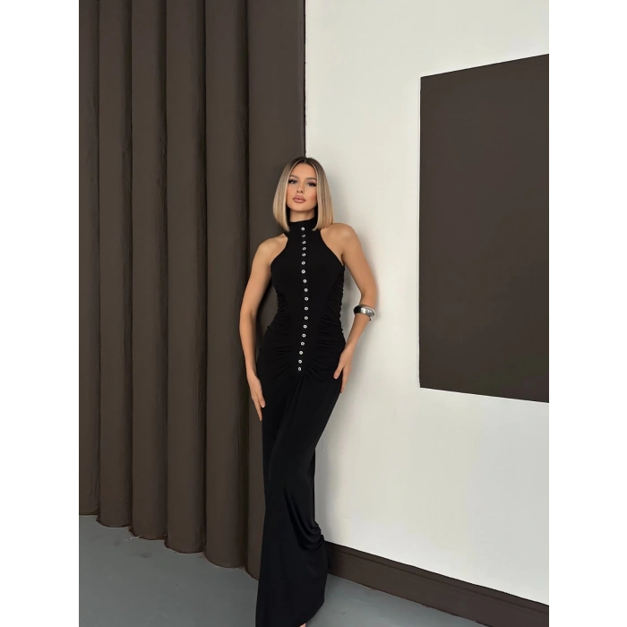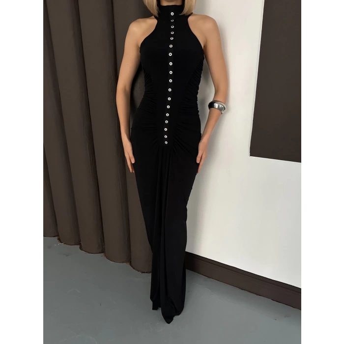 Düğme Detaylı C Yaka Uzun Elbise Siyah