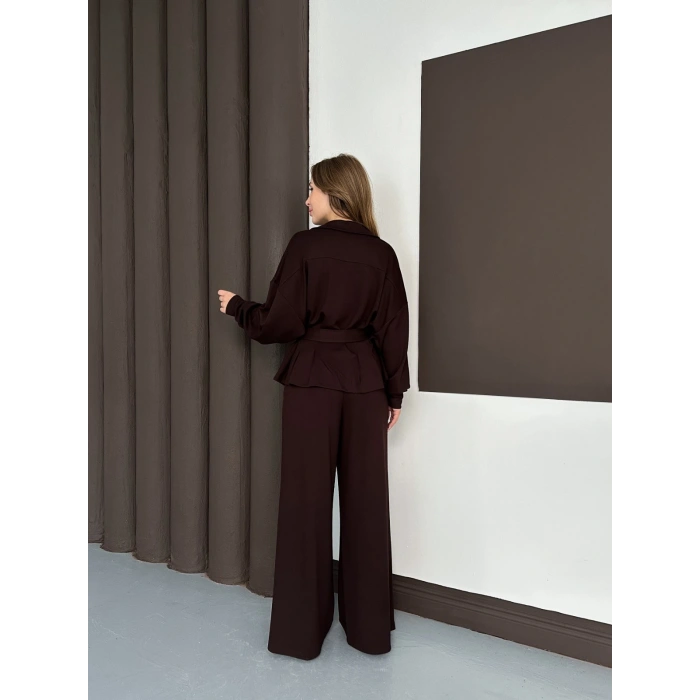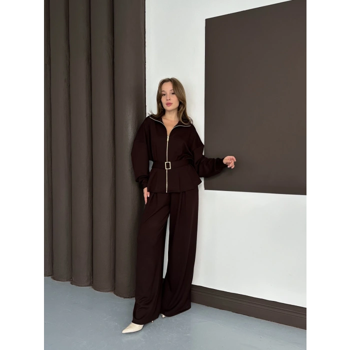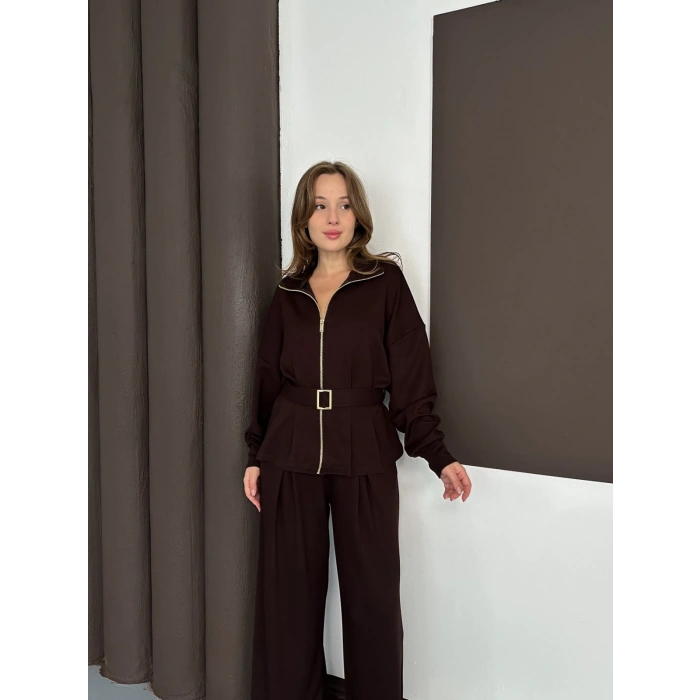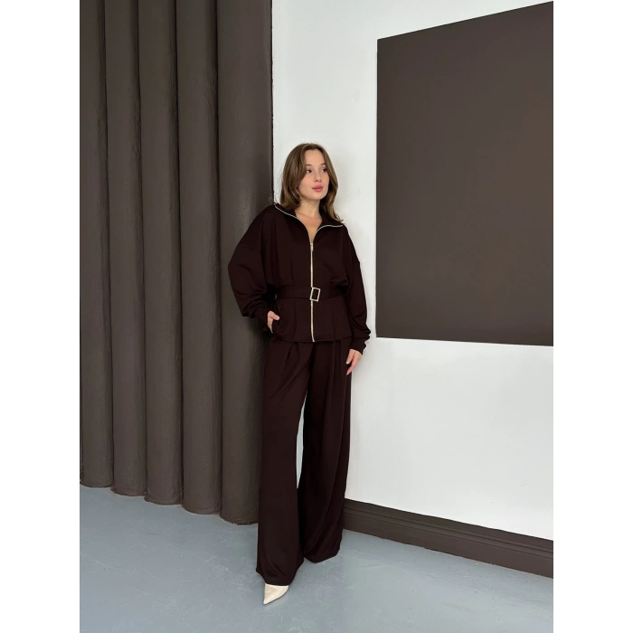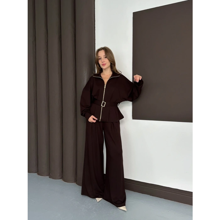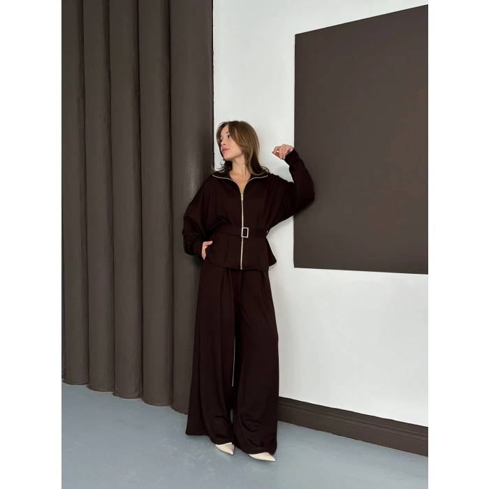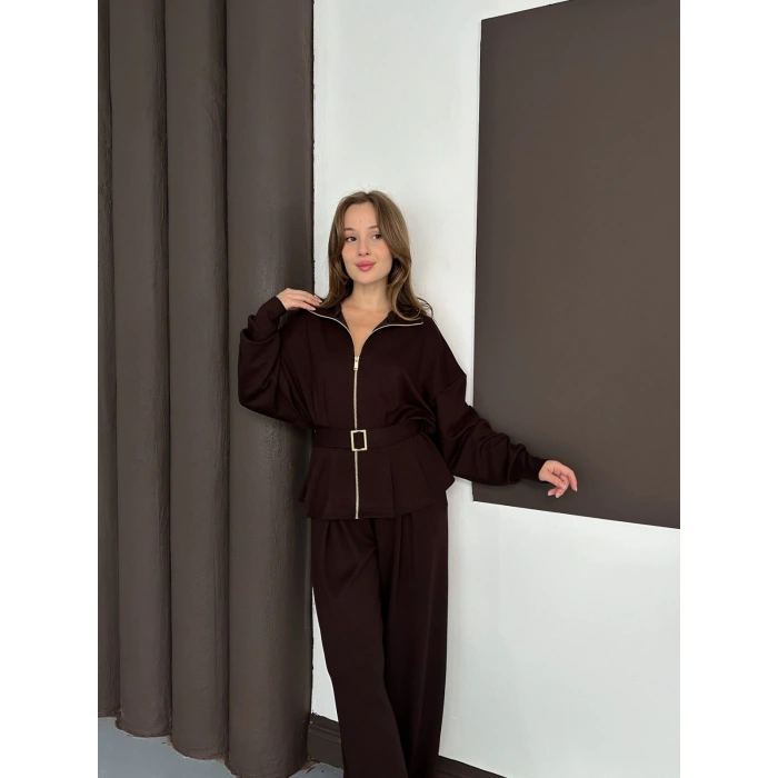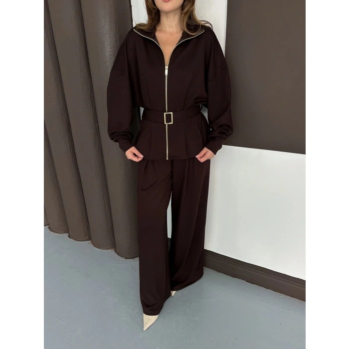 Fermuarlı Kemer Detaylı İkili Takım Acı Kahve