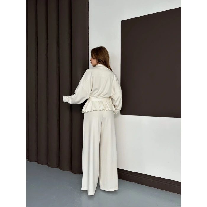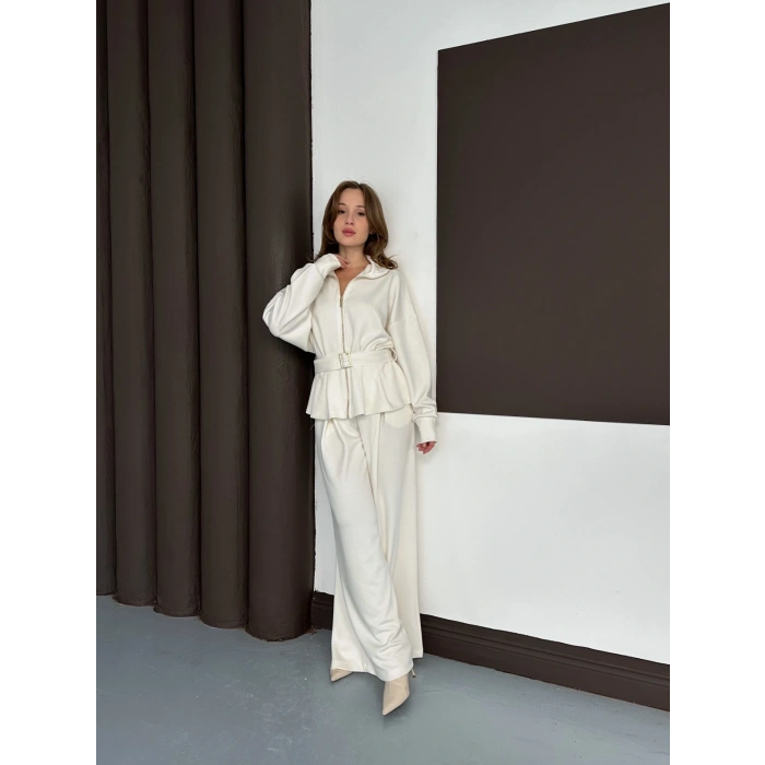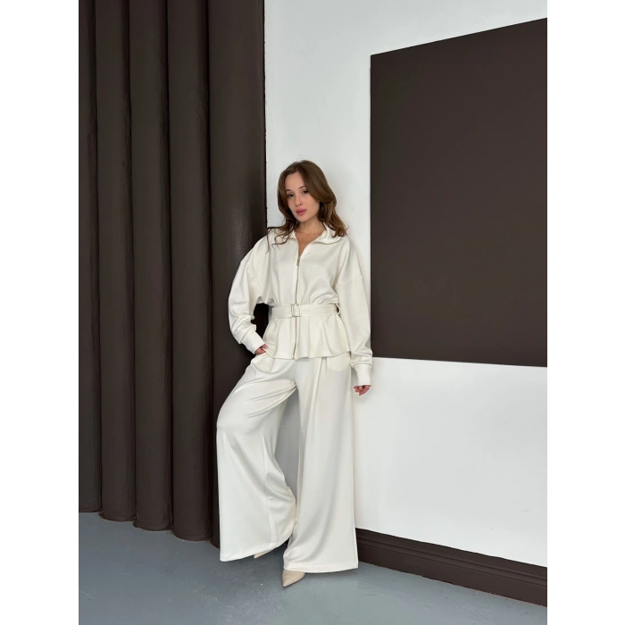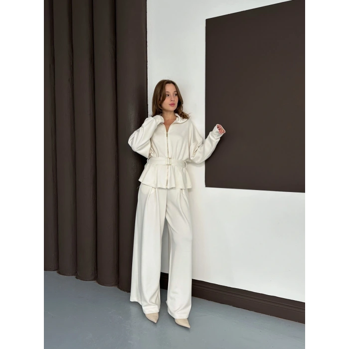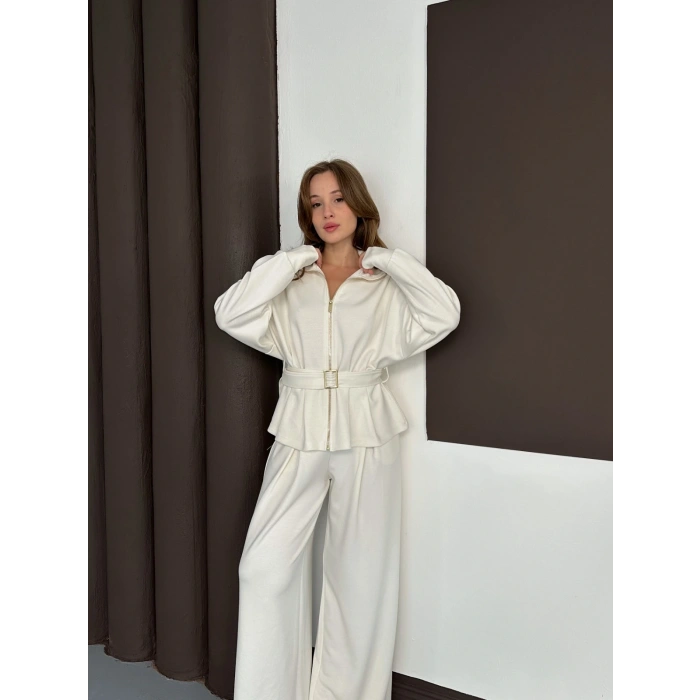 Fermuarlı Kemer Detaylı İkili Takım Beyaz