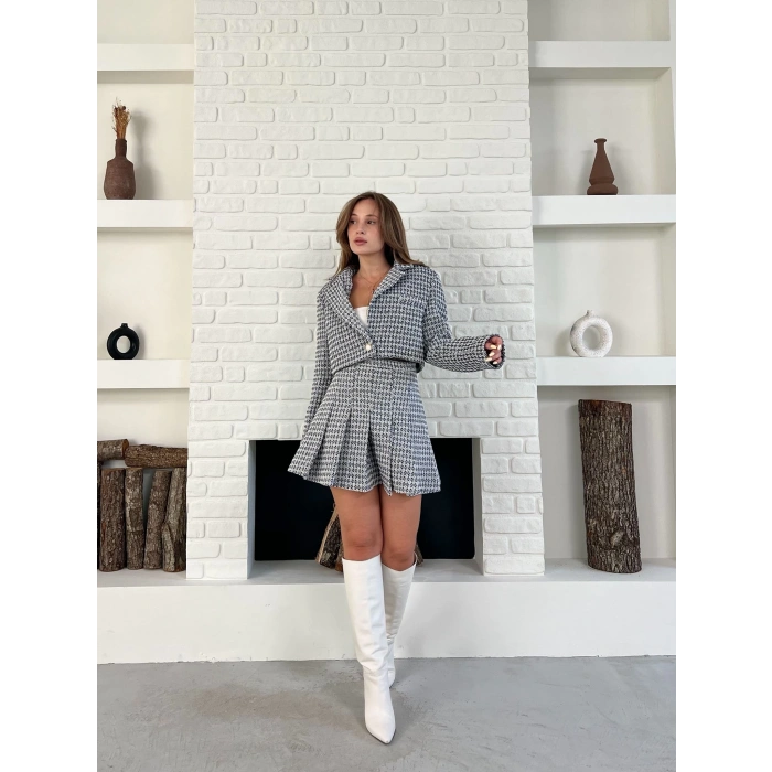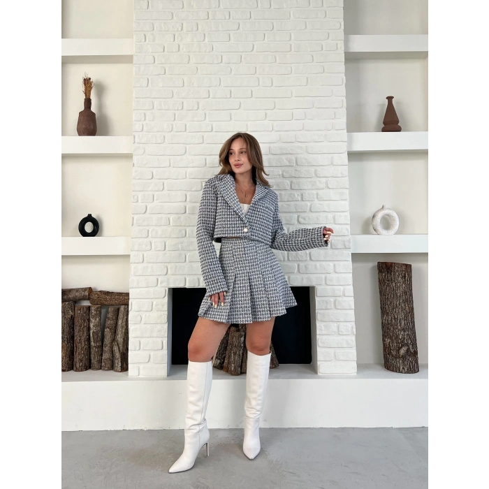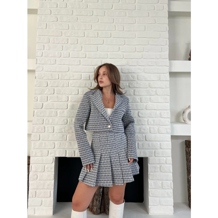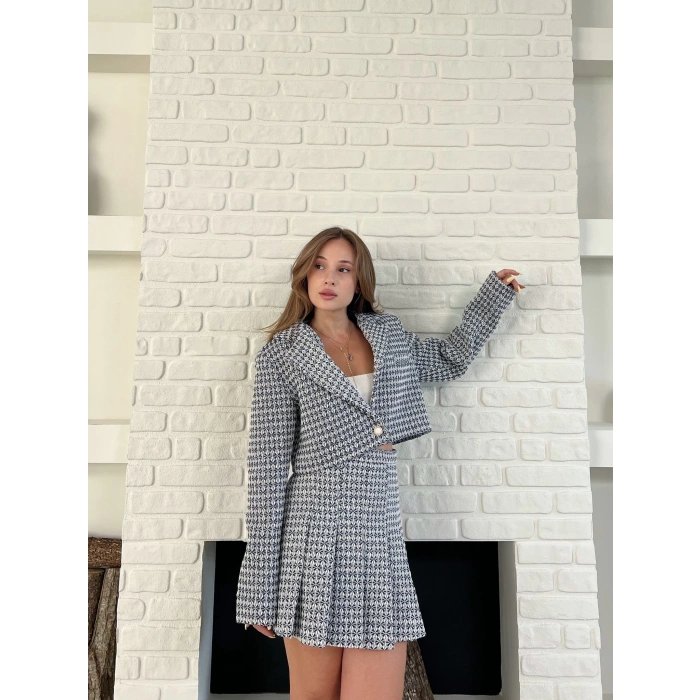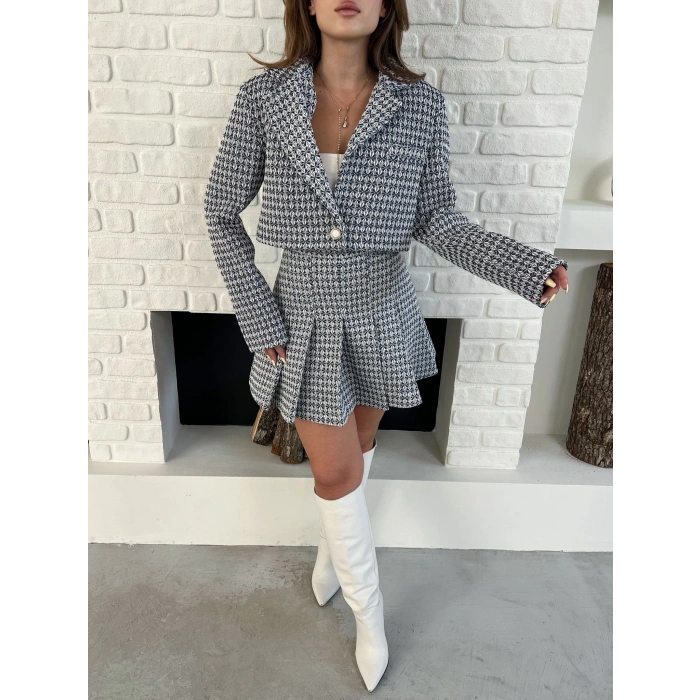 Kaz Ayağı Desen Pliseli Etek Crop Ceket Takım Lacivert