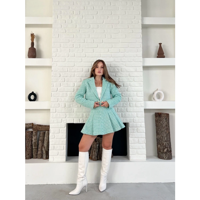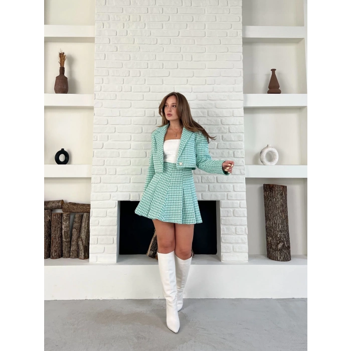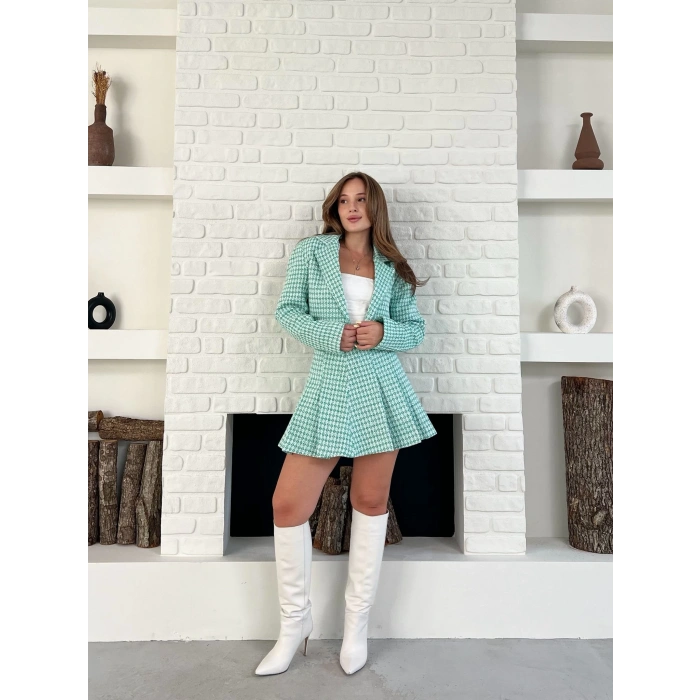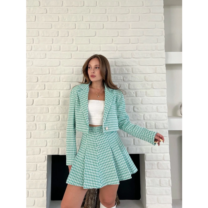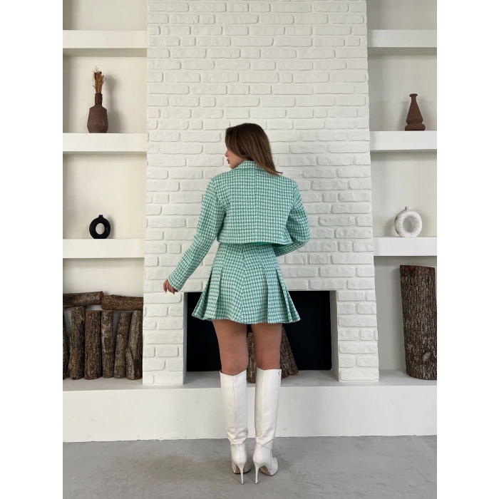 Kaz Ayağı Desen Pliseli Etek Crop Ceket Takım Mint