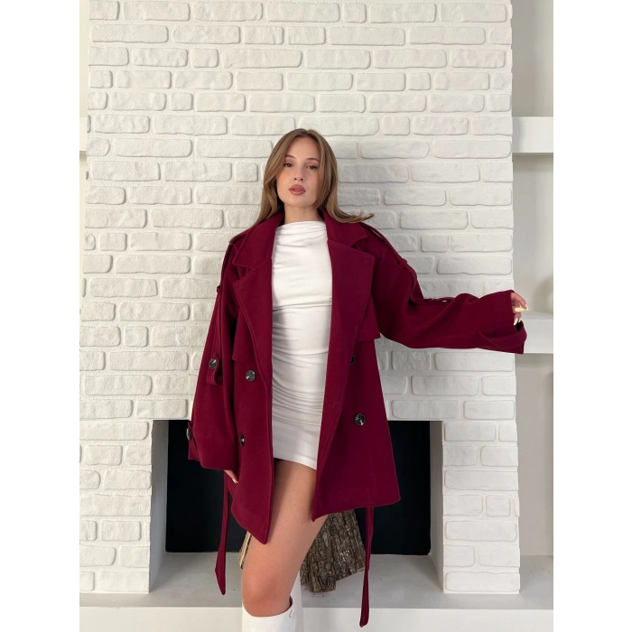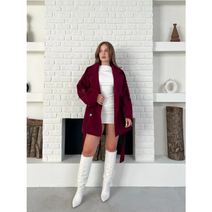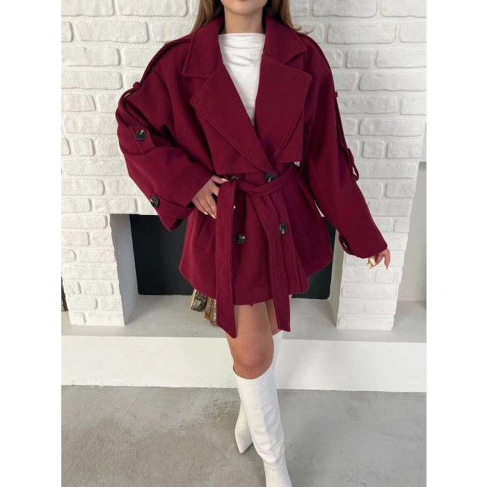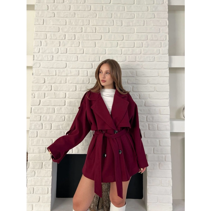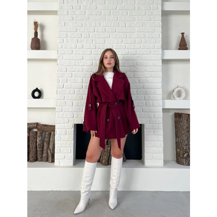Kemer Detaylı Kısa Kaşe Kaban Bordo