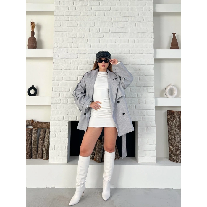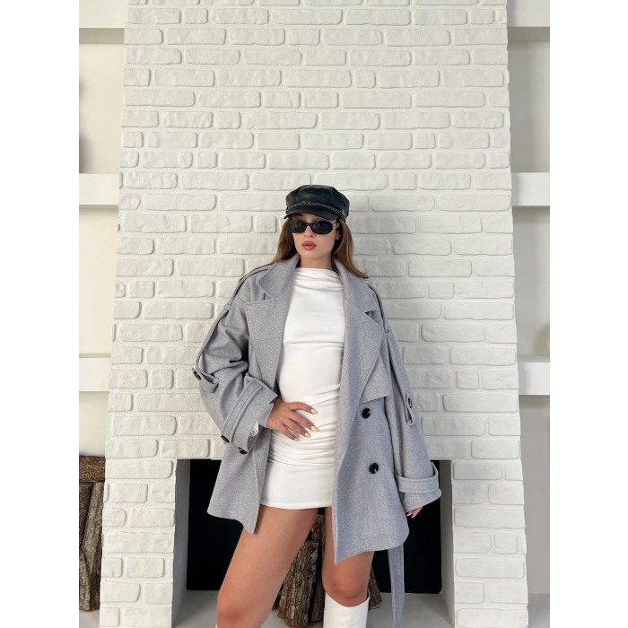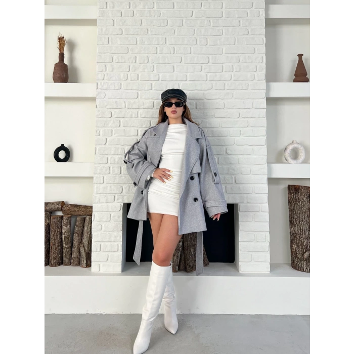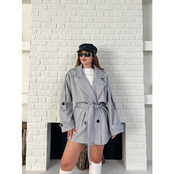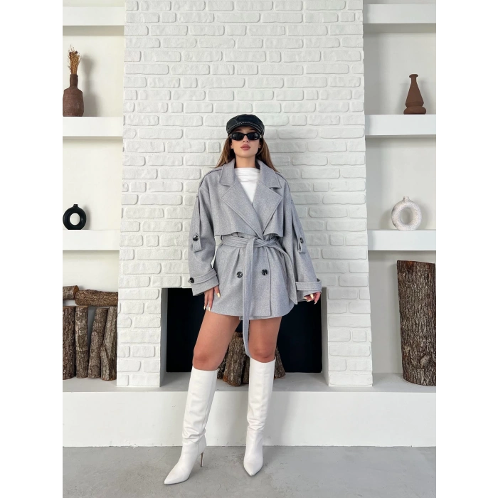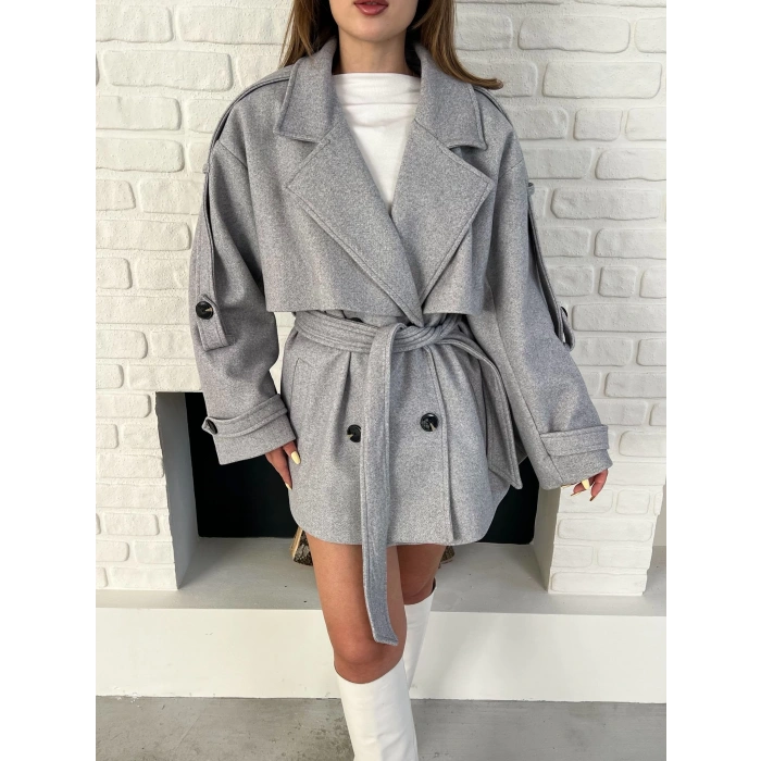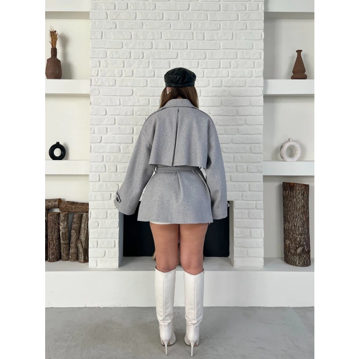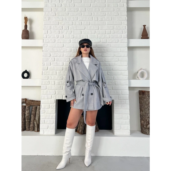 Kemer Detaylı Kısa Kaşe Kaban Gri