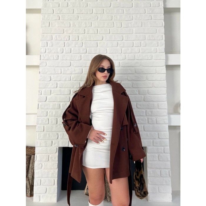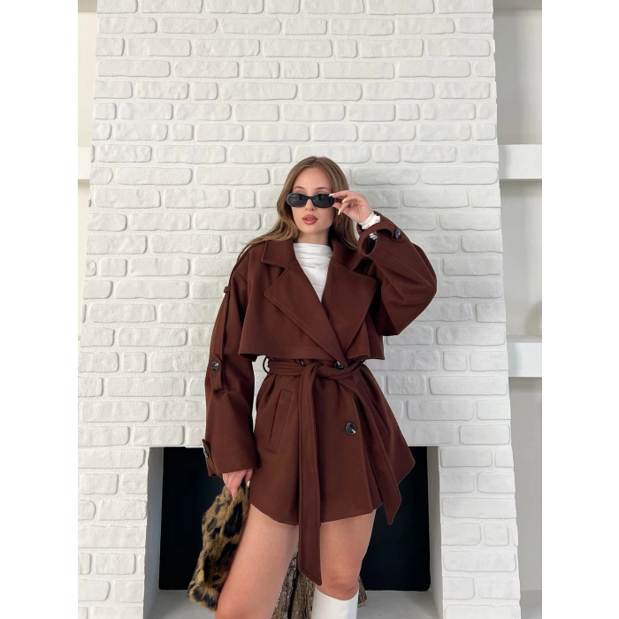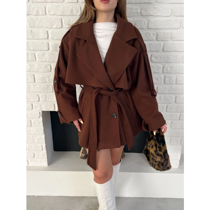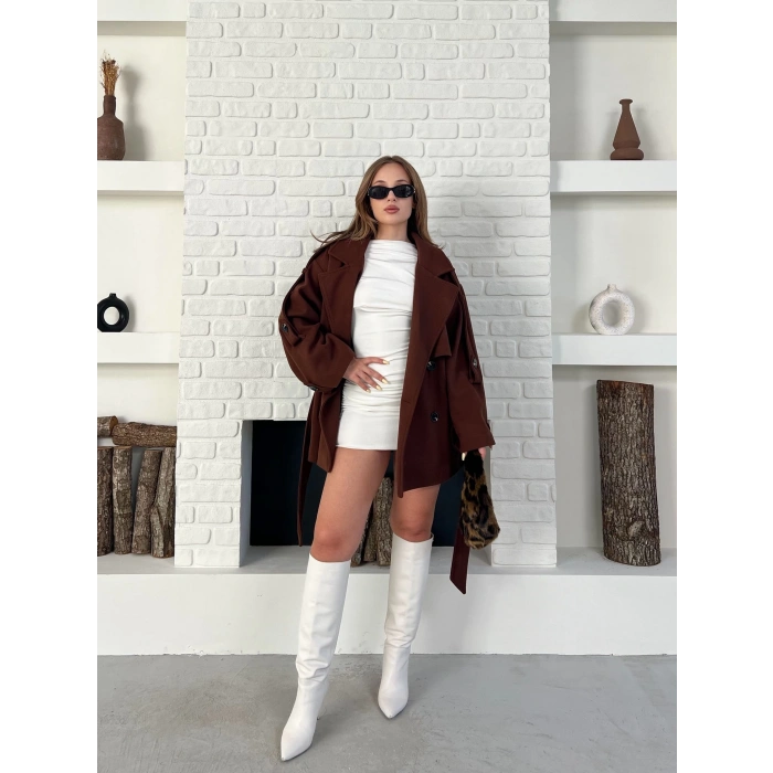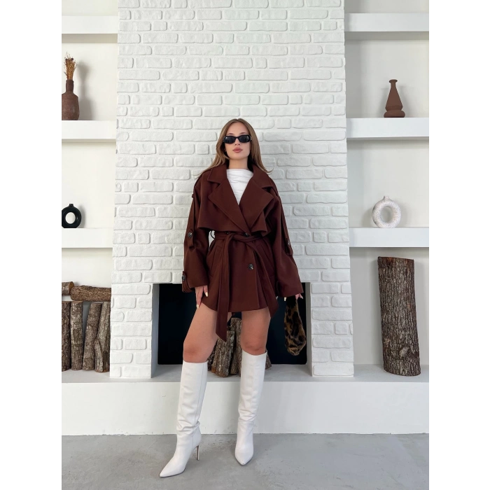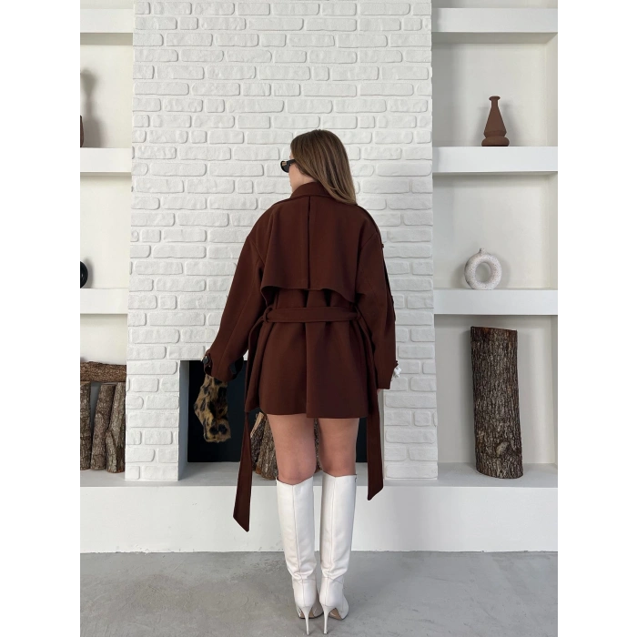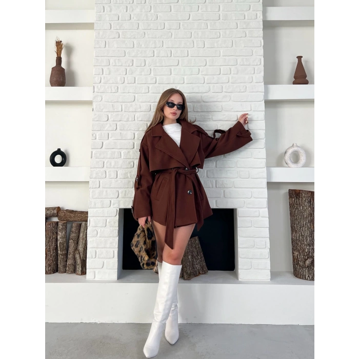 Kemer Detaylı Kısa Kaşe Kaban Kahve