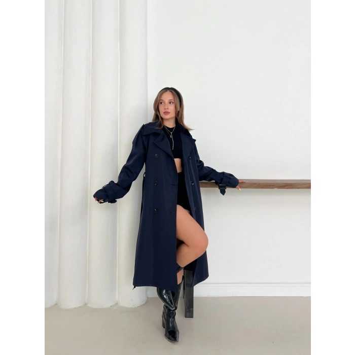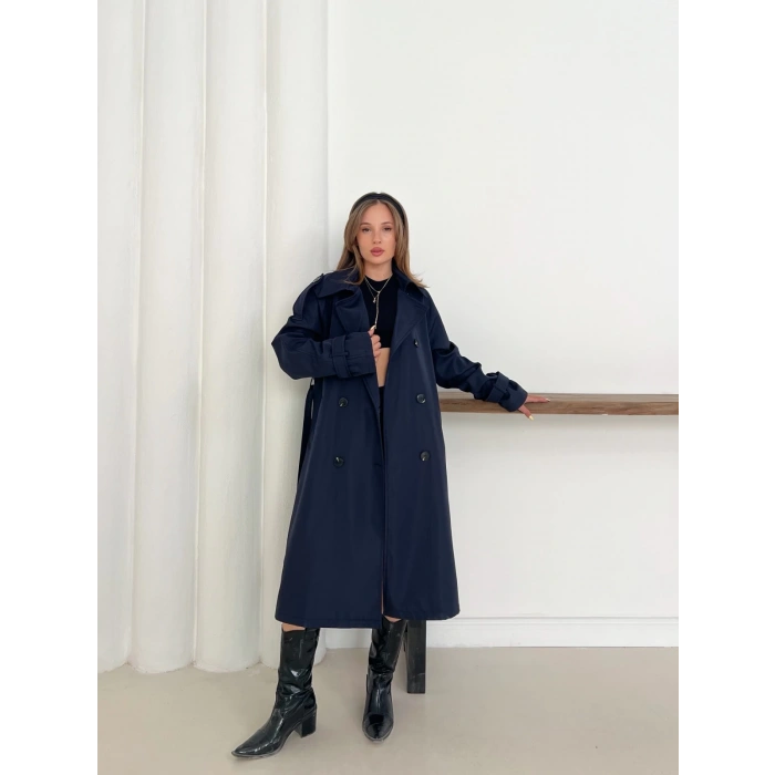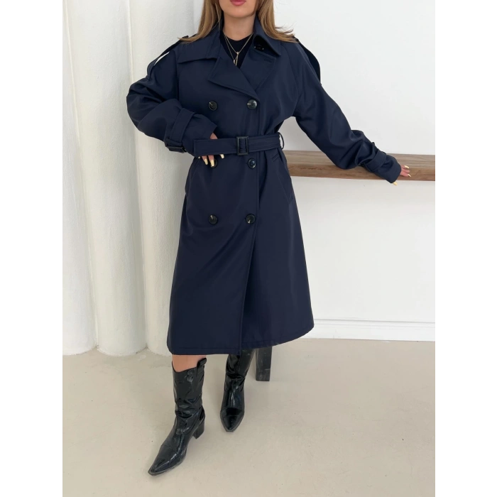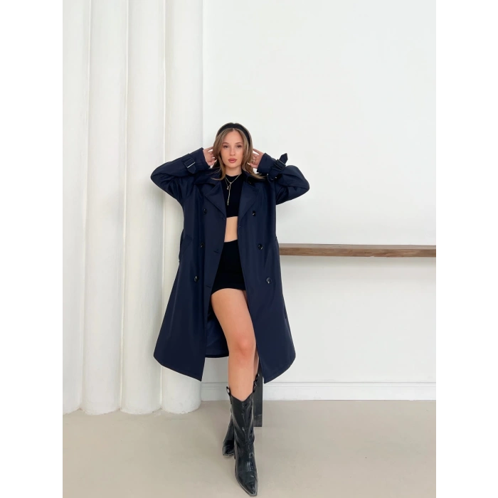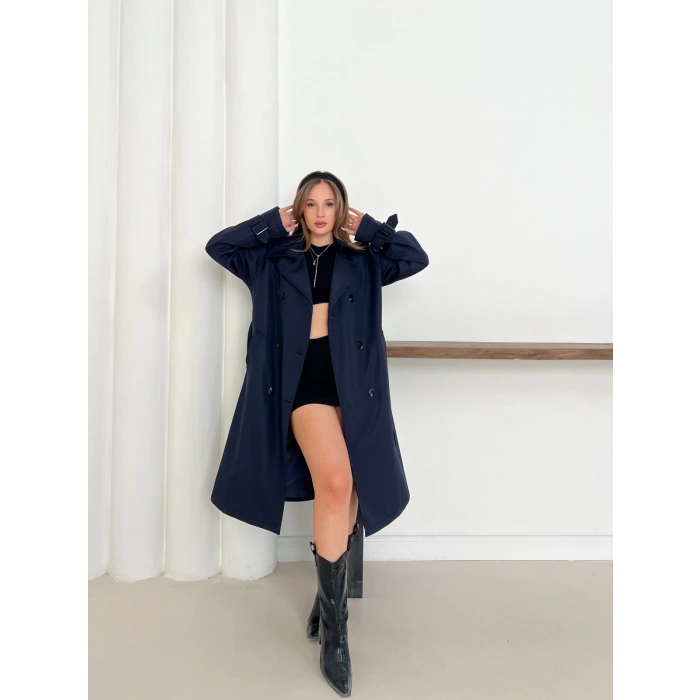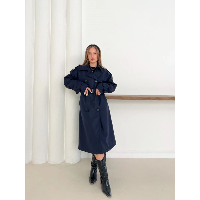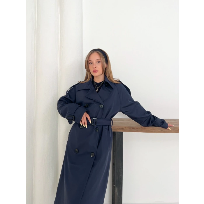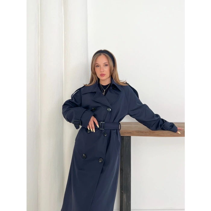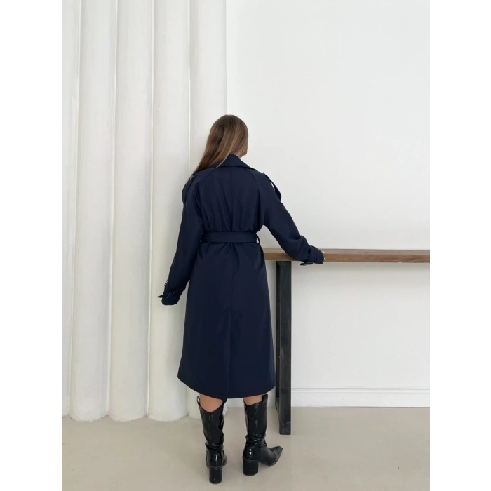 Kemer Detaylı Midiboy Trençkot Lacivert