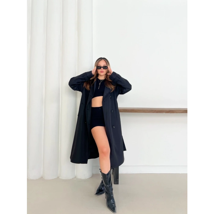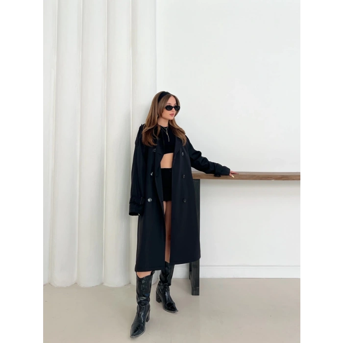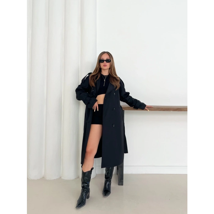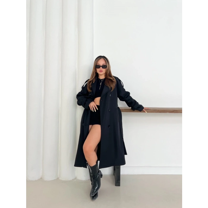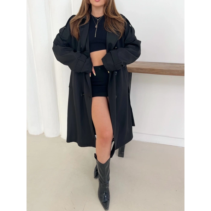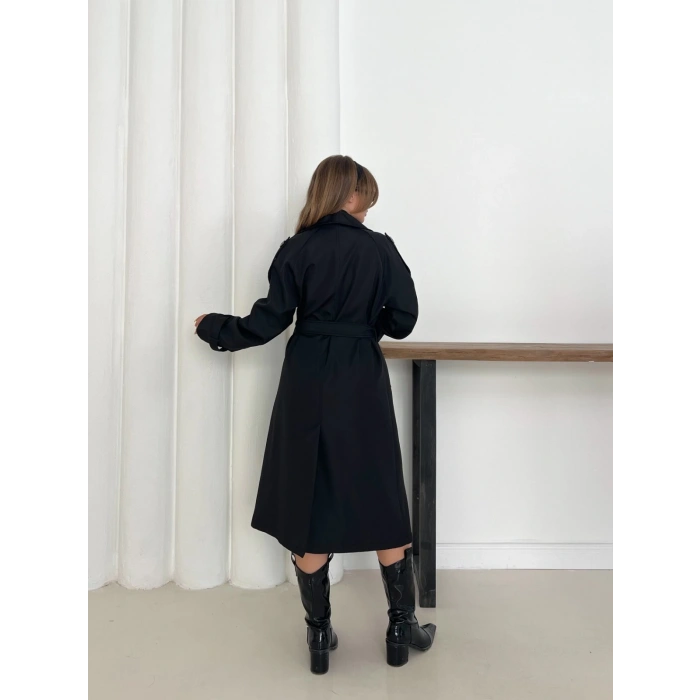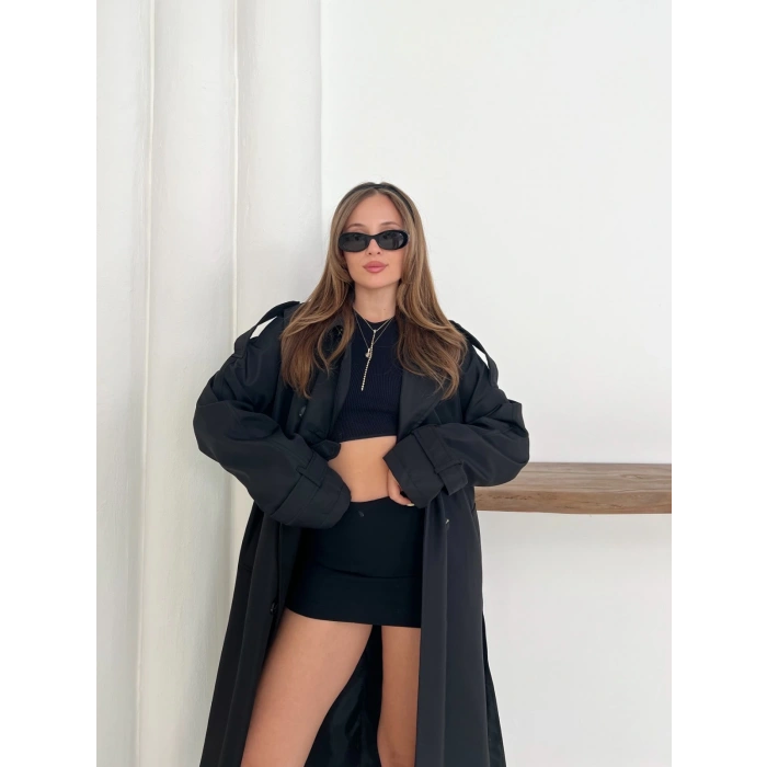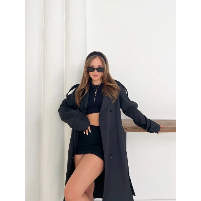 Kemer Detaylı Midiboy Trençkot Siyah