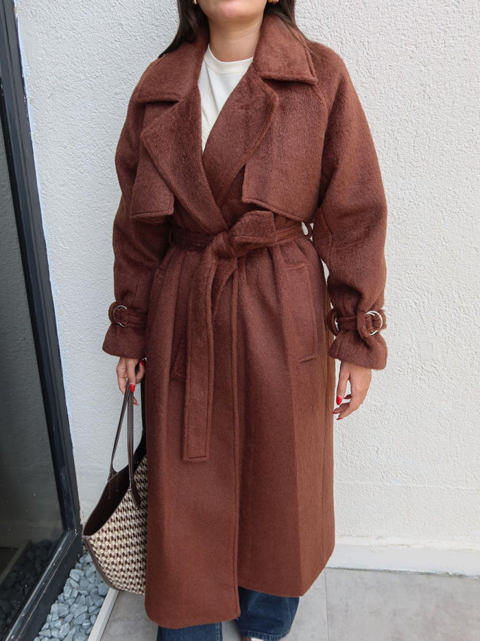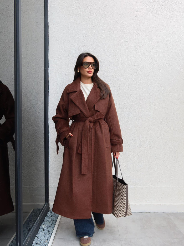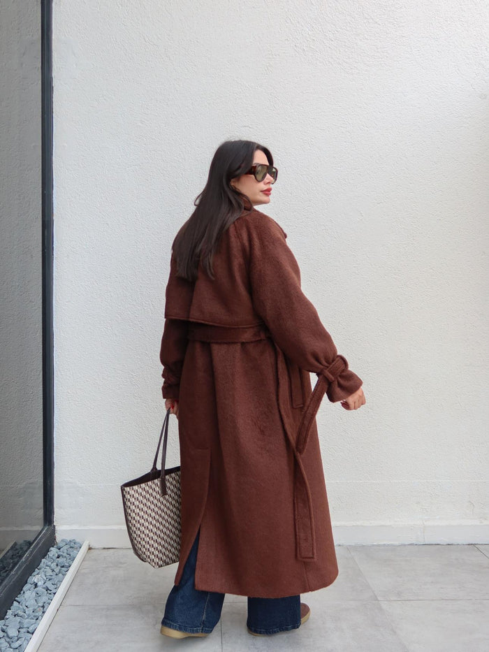 Kruvaze Kol Kemerli Kuşaklı Yün Kaban