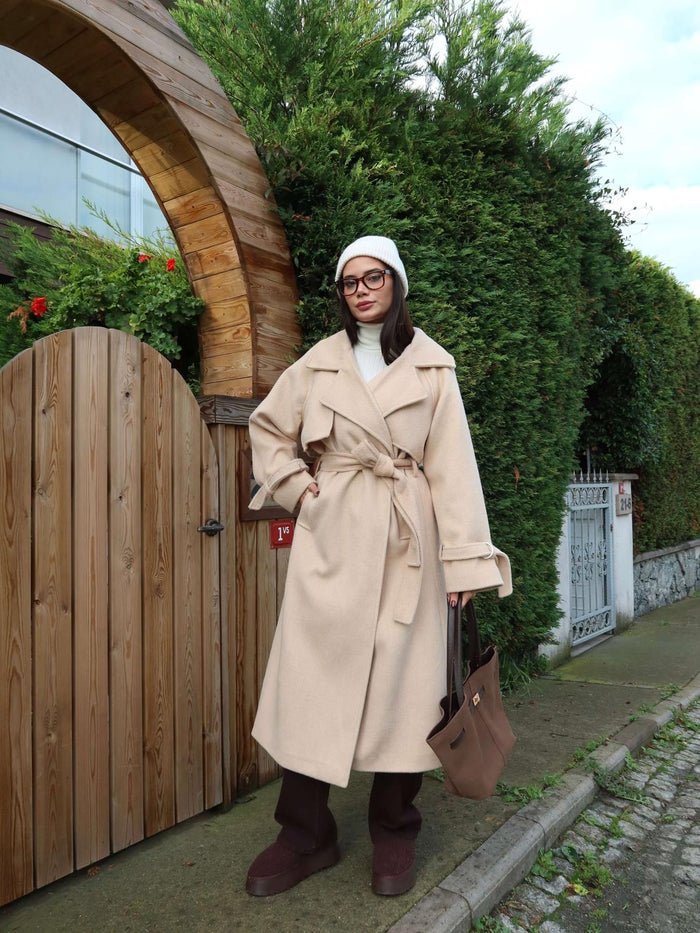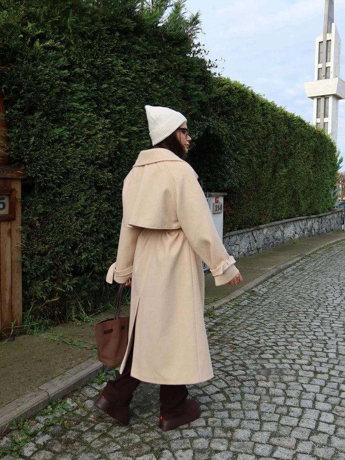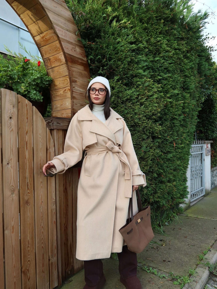 Kruvaze Kol Kemerli Kuşaklı Yün Kaban