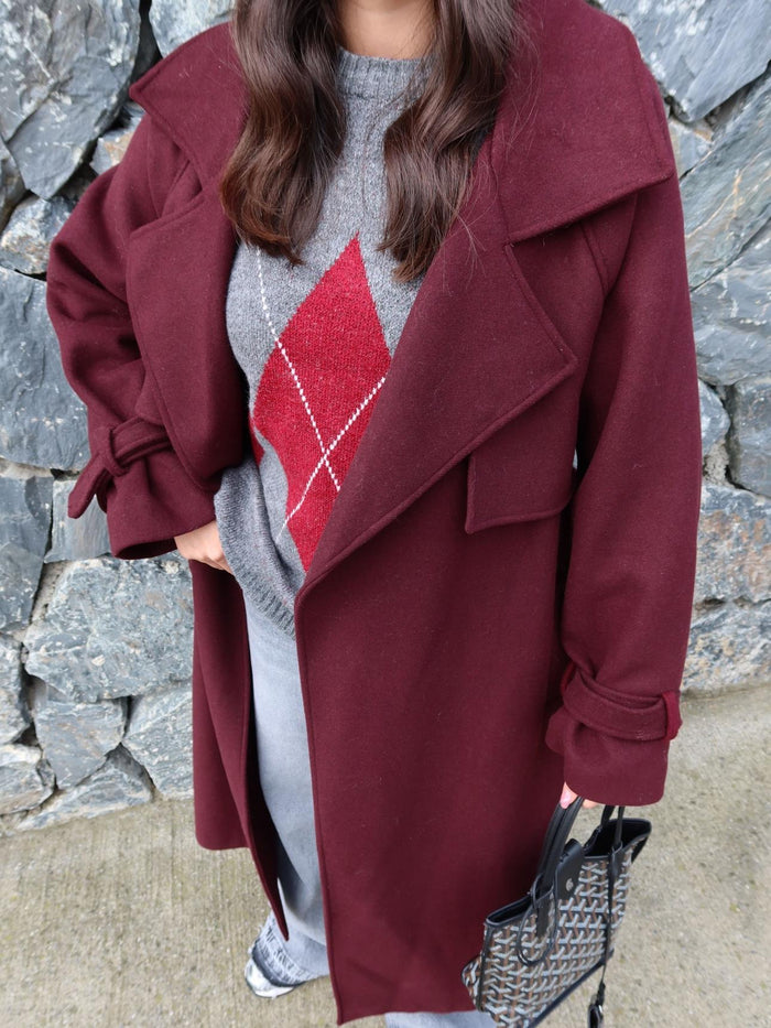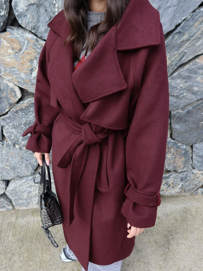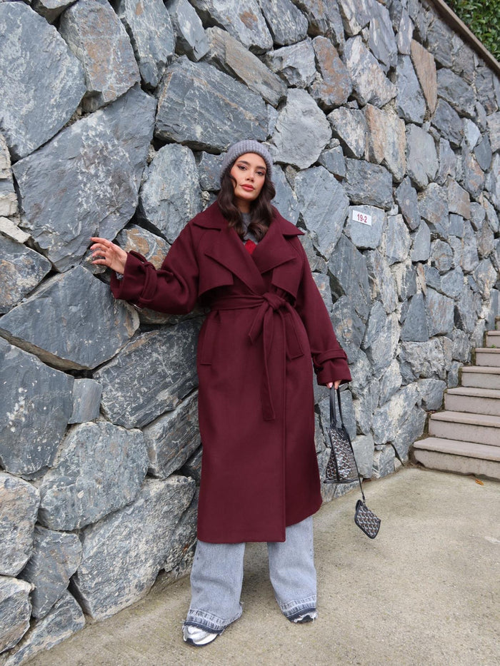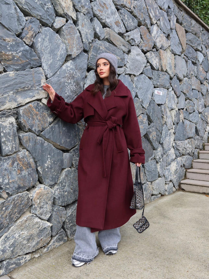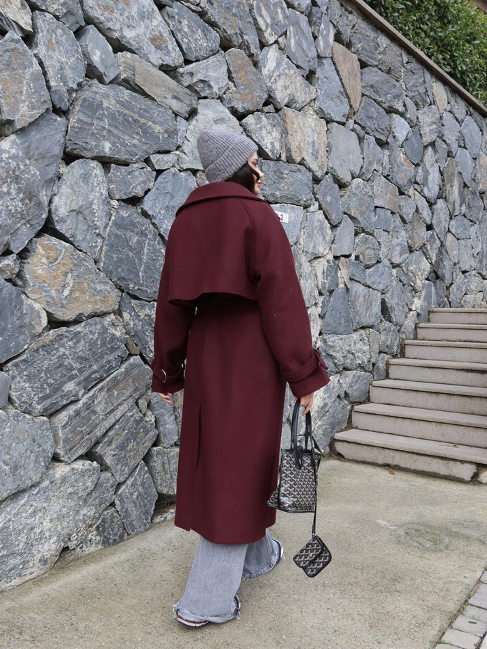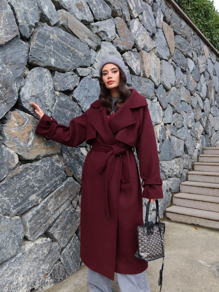 Kruvaze Kol Kemerli Kuşaklı Yün Kaban