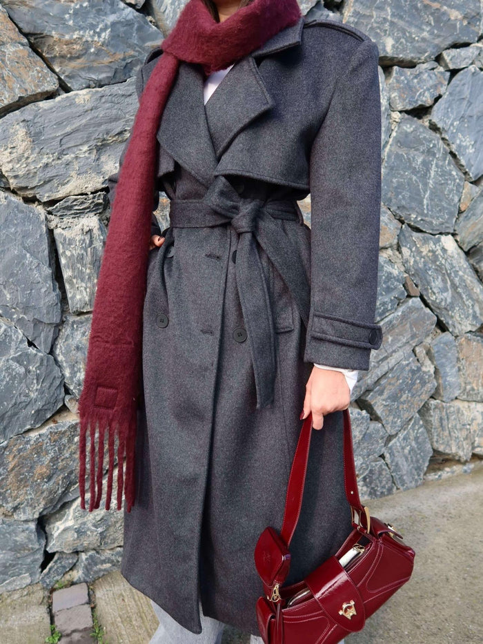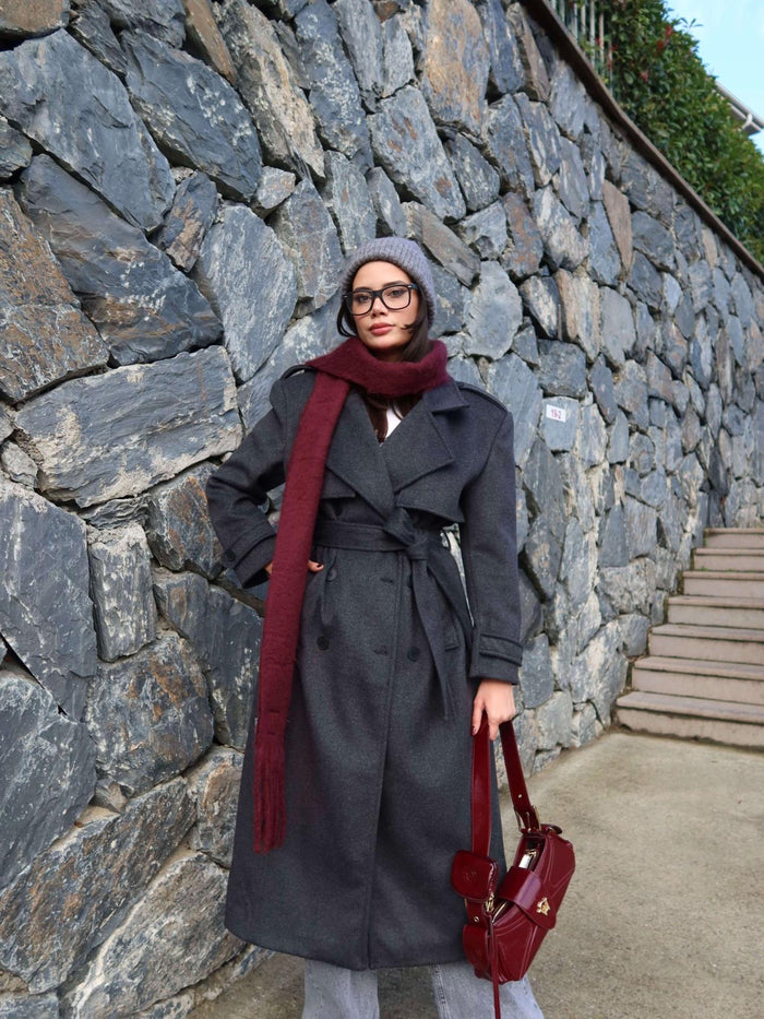 Kruvaze Yaka Parça Detay Apoletli Kuşaklı Kaban