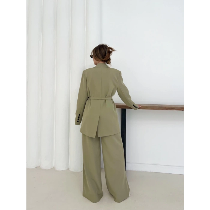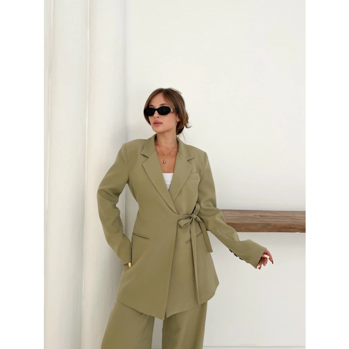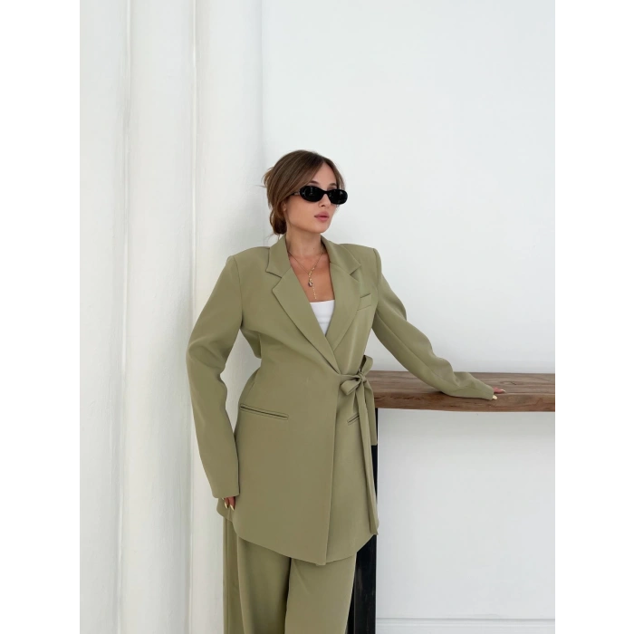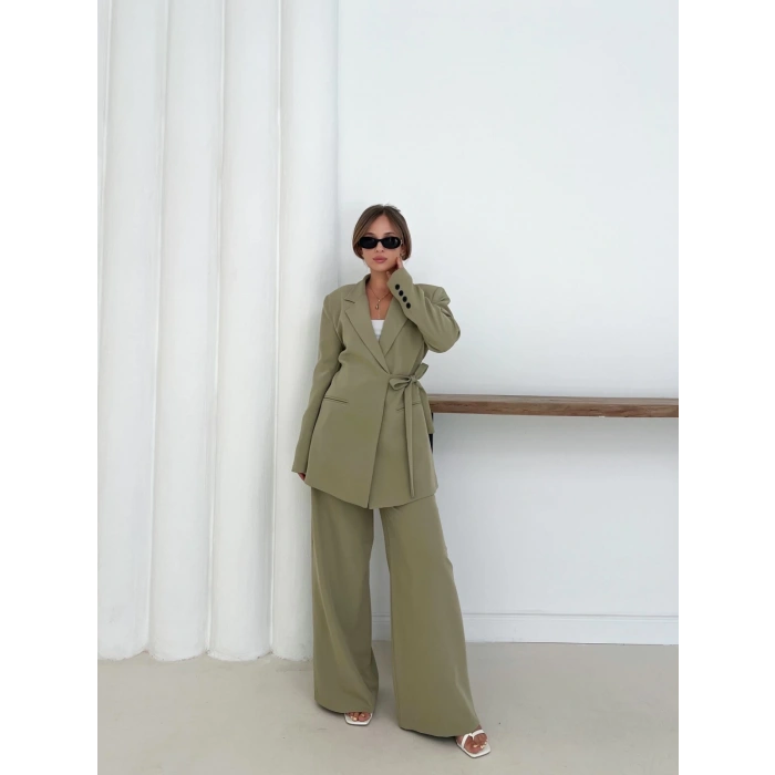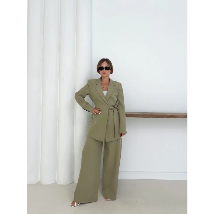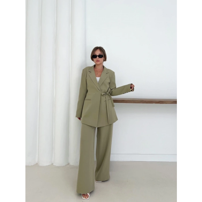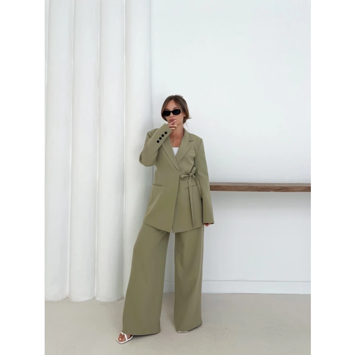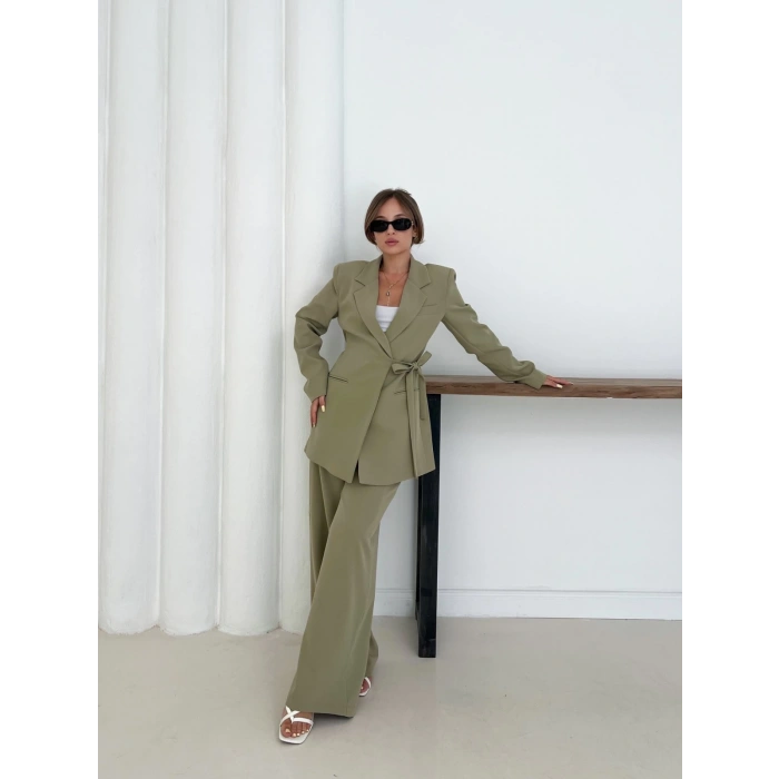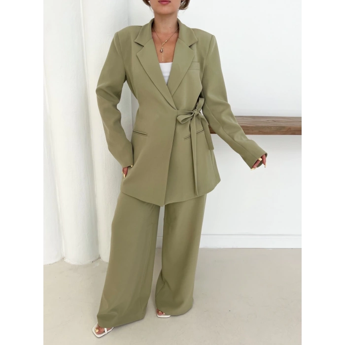 Kruvaze Yaka Yan Bağlama Detay Takım Haki