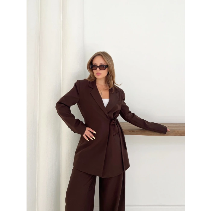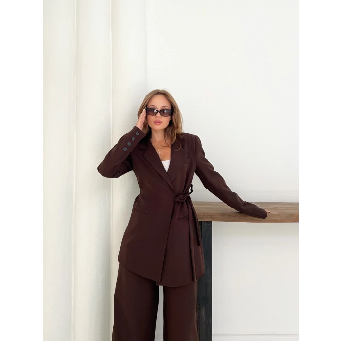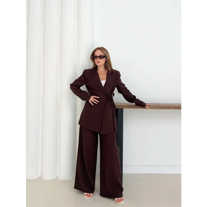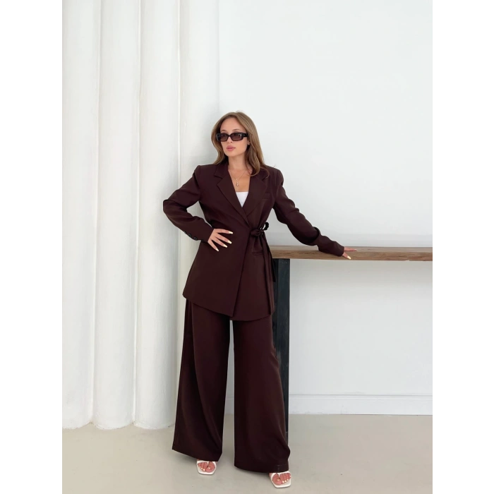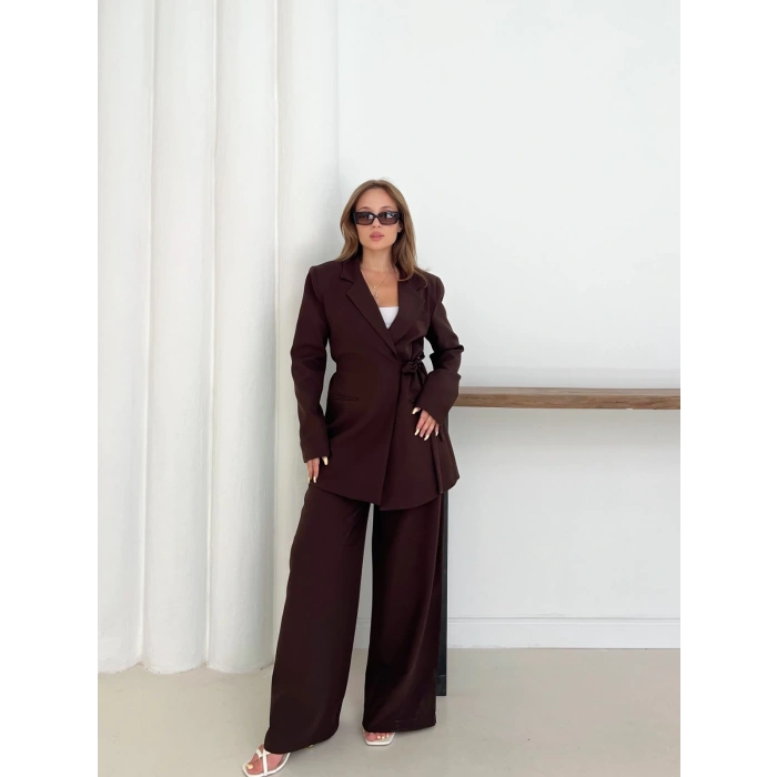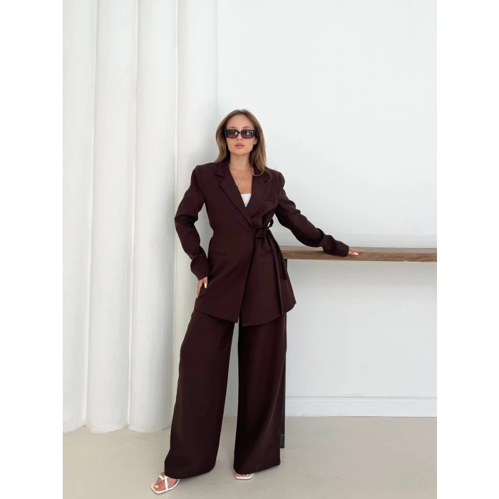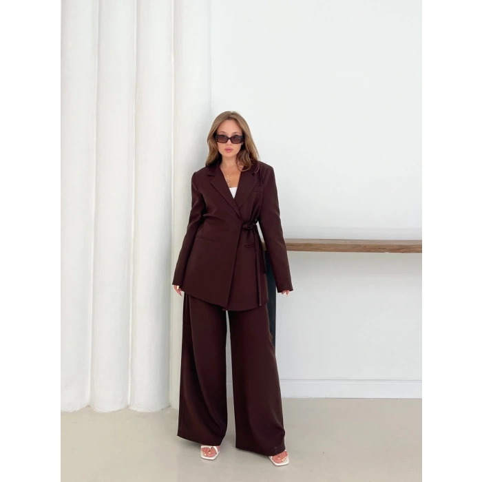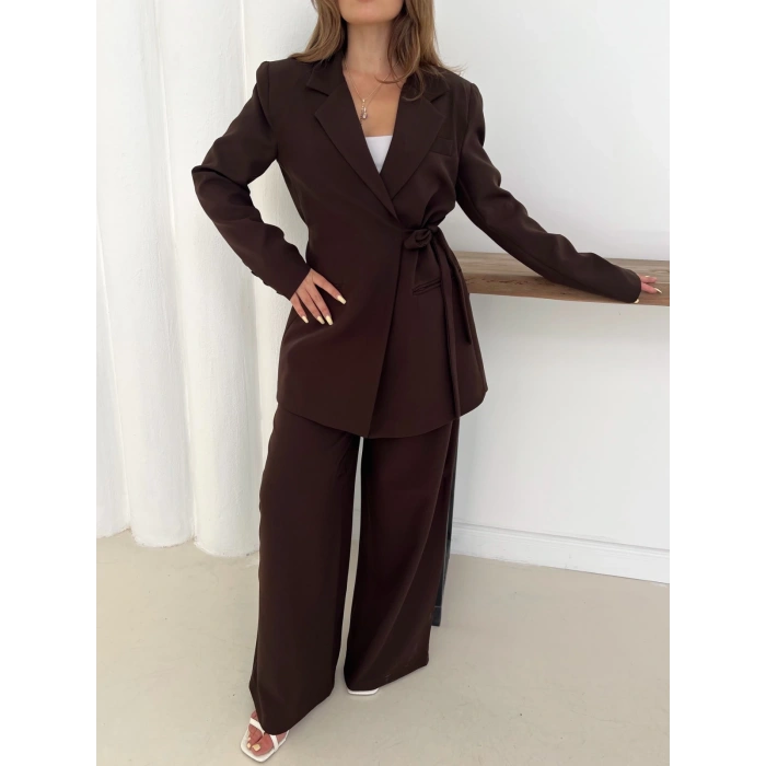 Kruvaze Yaka Yan Bağlama Detay Takım Kahverengi