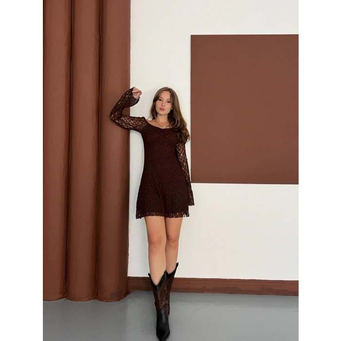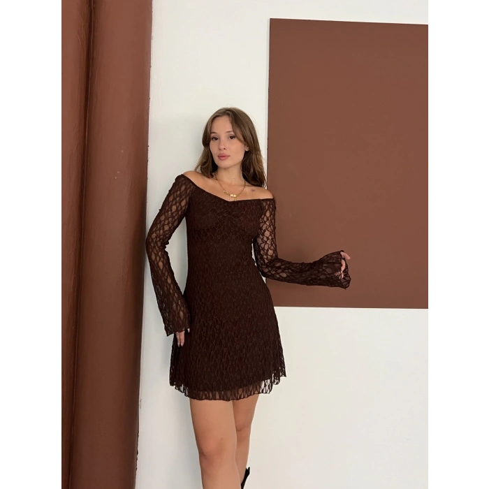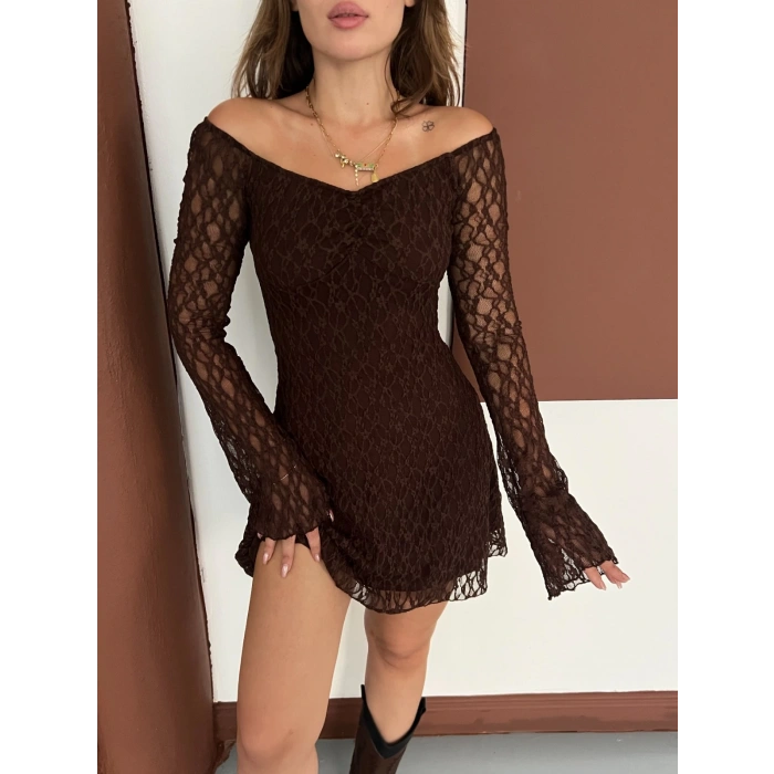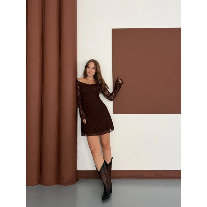 Madonna Yaka Dantel Detaylı Kısa Elbise Acı Kahve