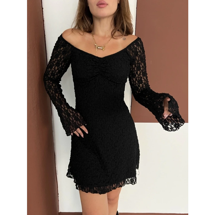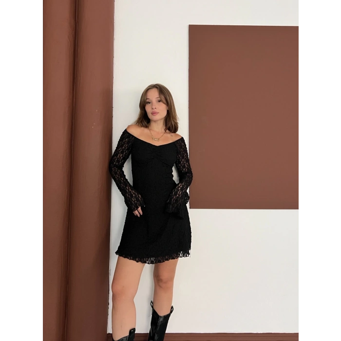 Madonna Yaka Dantel Detaylı Kısa Elbise Siyah