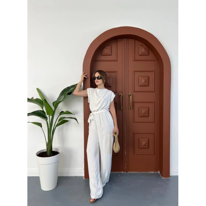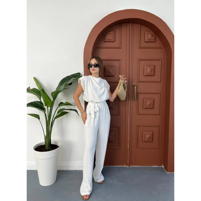 Omuz Vatkalı Bel Kuşaklı Premium Tulum Beyaz