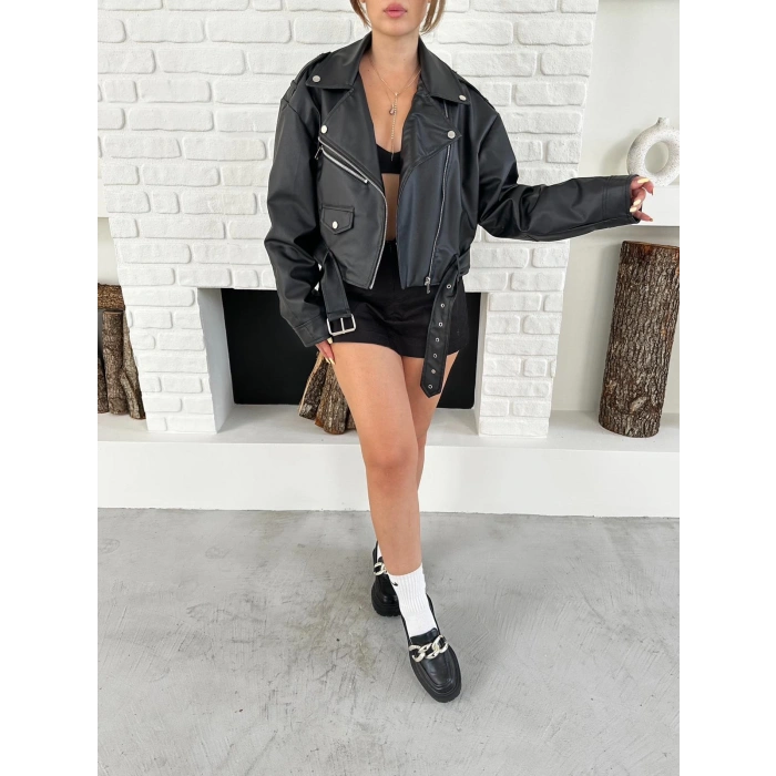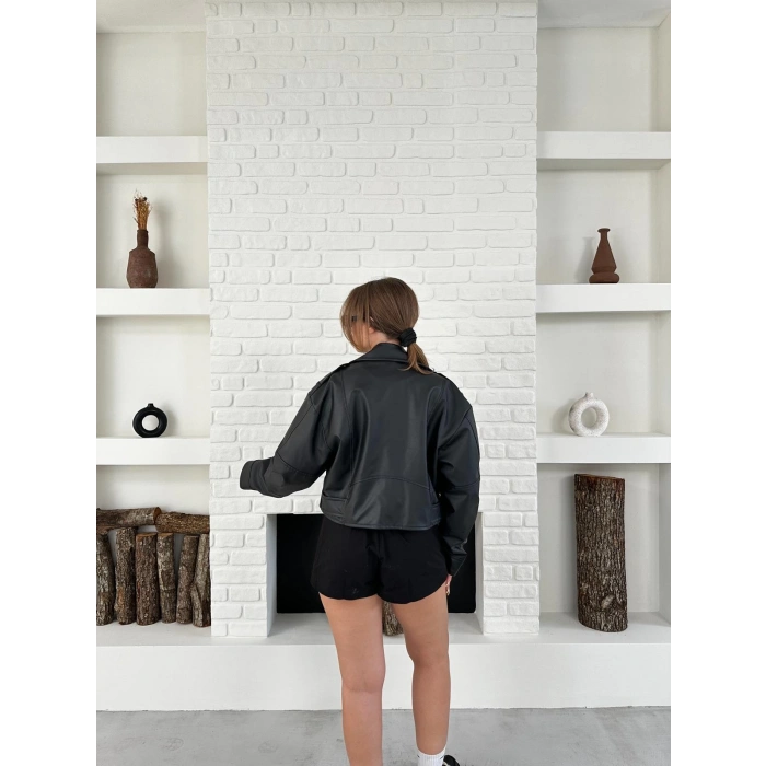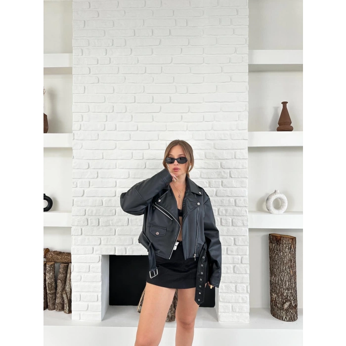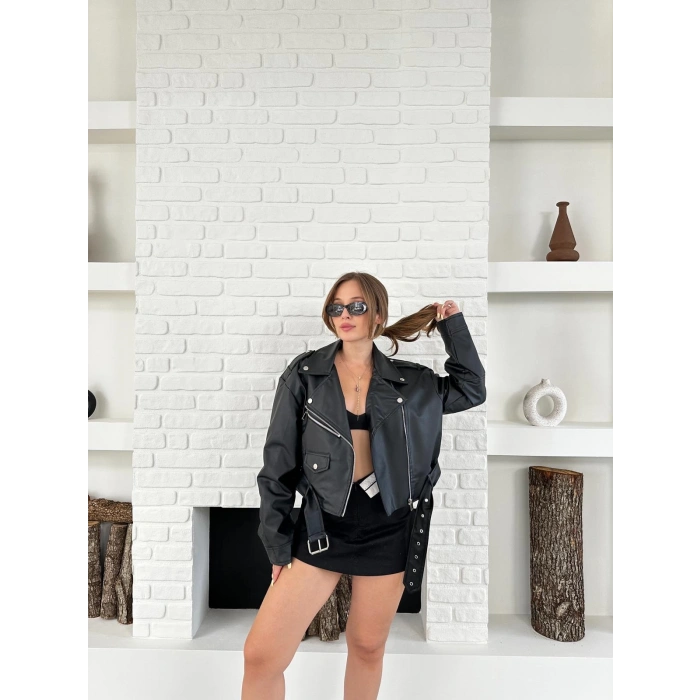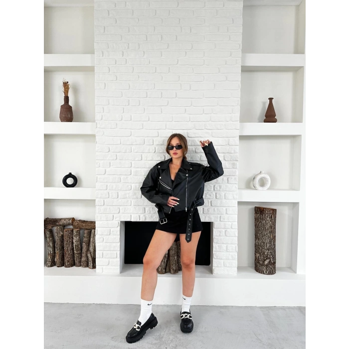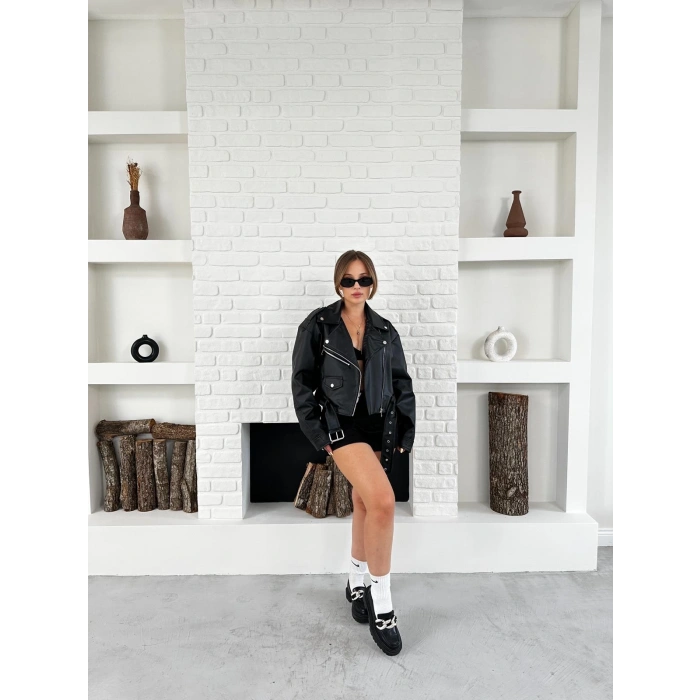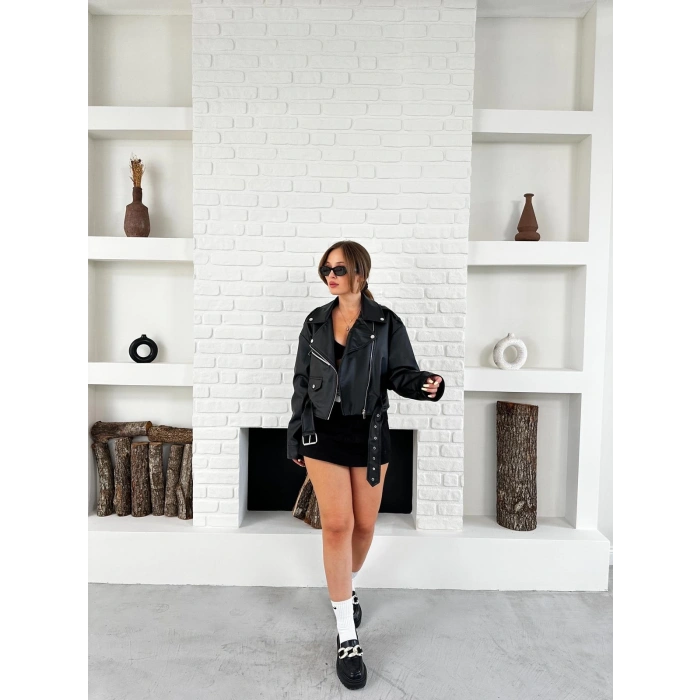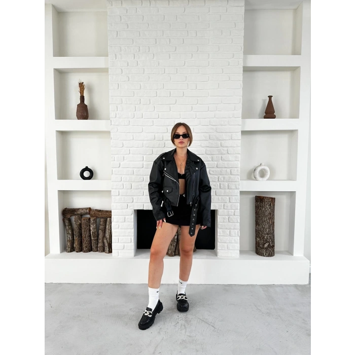 Özel Tasarım Aksesuarlı Deri Ceket Siyah