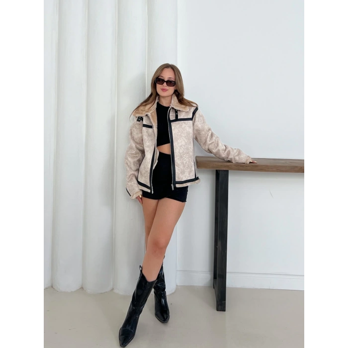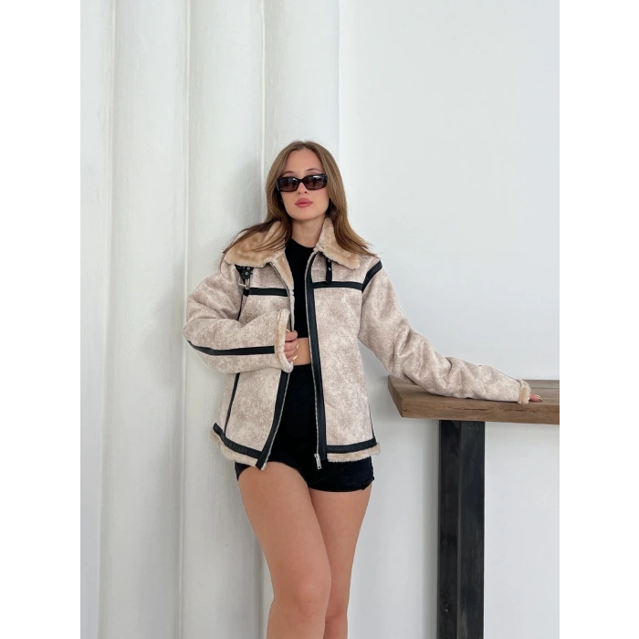 Peluşlu Yaka Kemer Detaylı Ceket Vizon