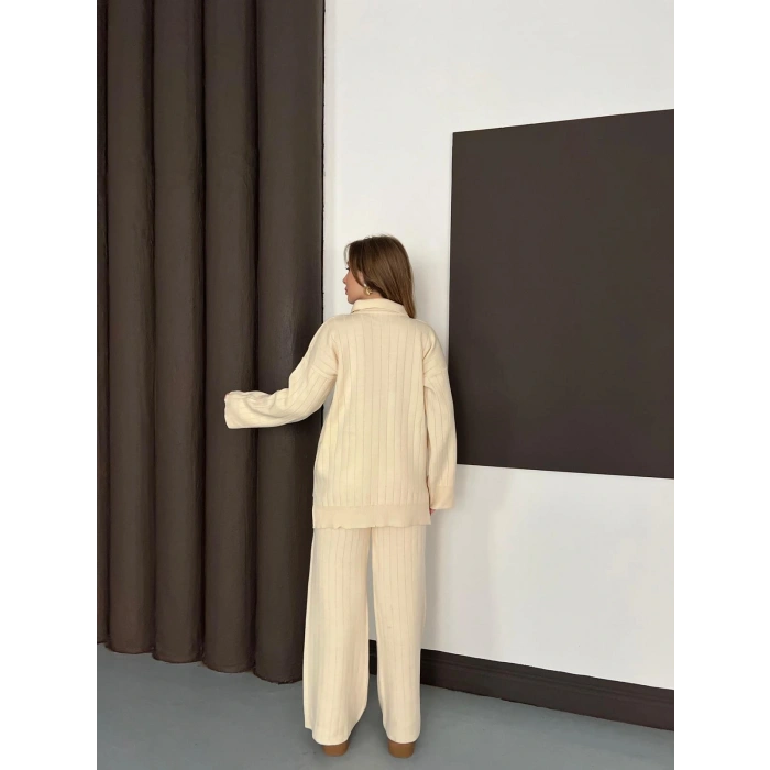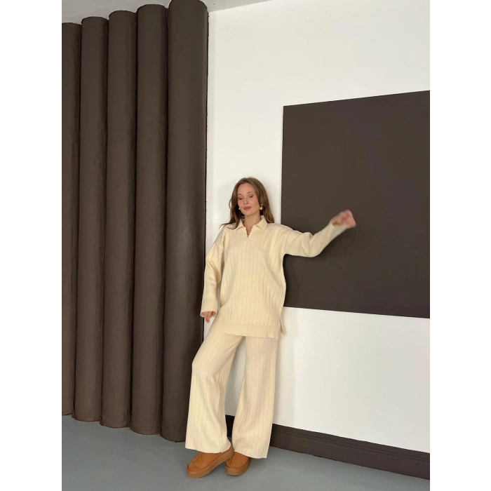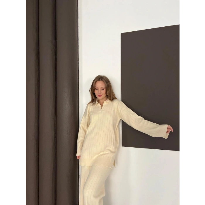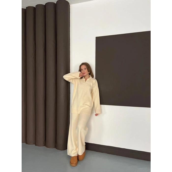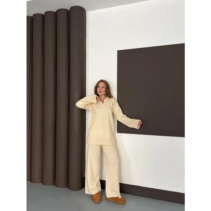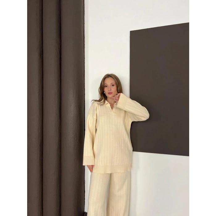 Polo Yaka Triko Pantolonlu Takım Ekru