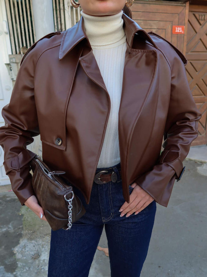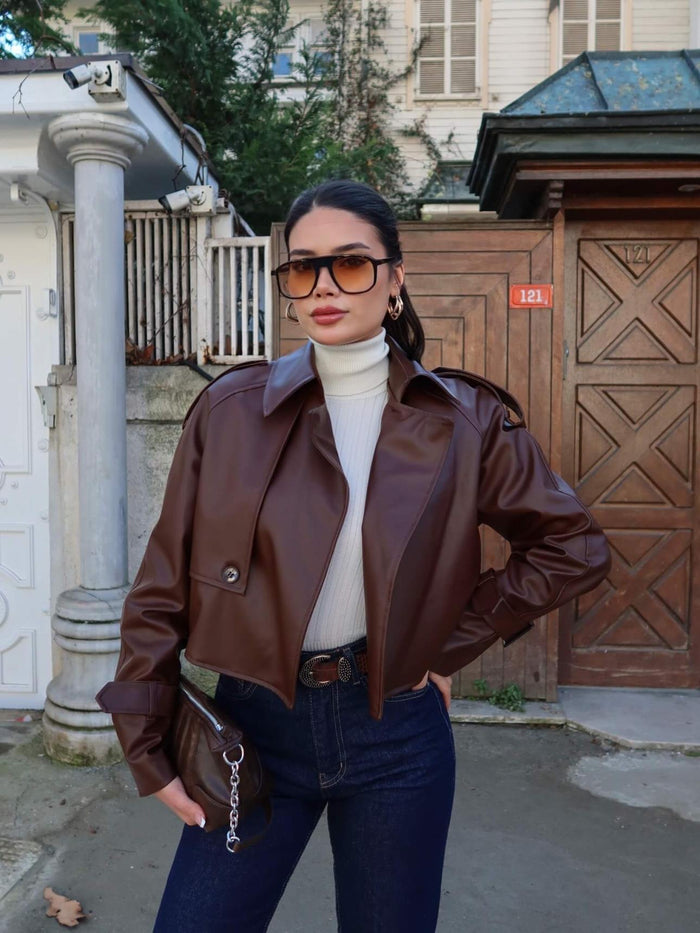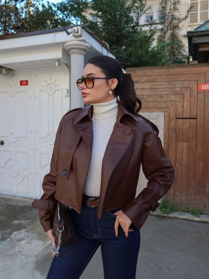 Tasarım Parçalı Kısa Deri Ceket