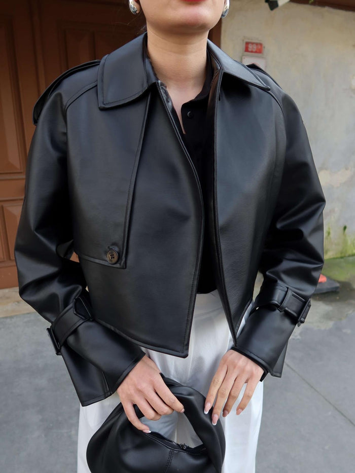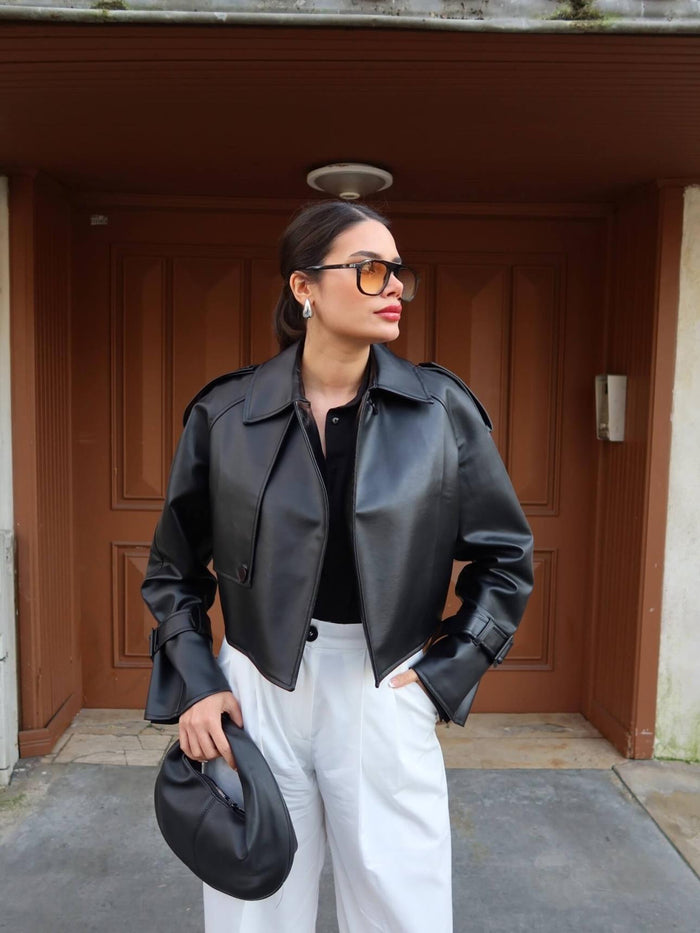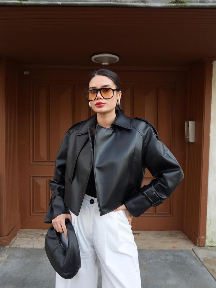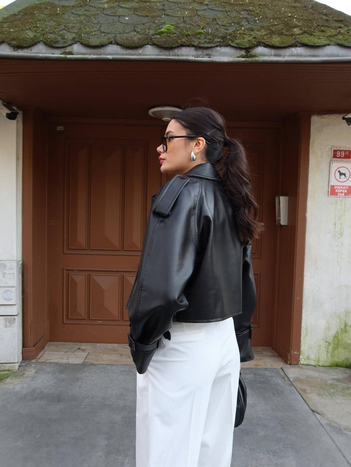 Tasarım Parçalı Kısa Deri Ceket