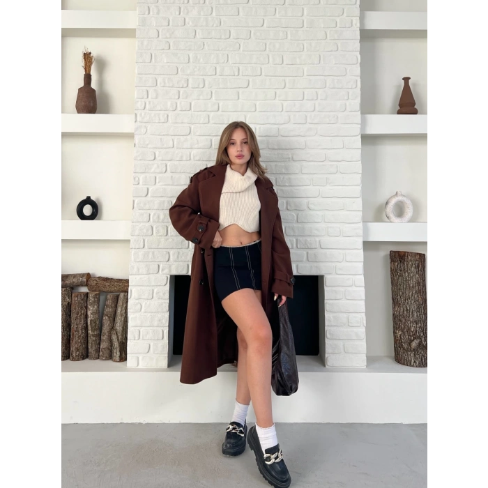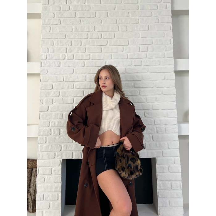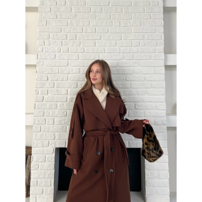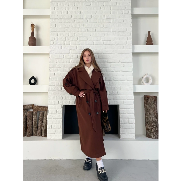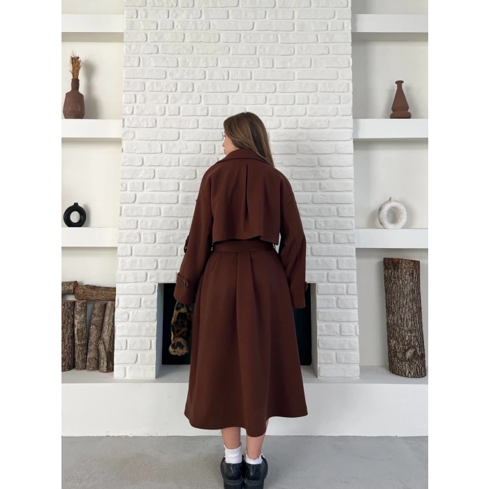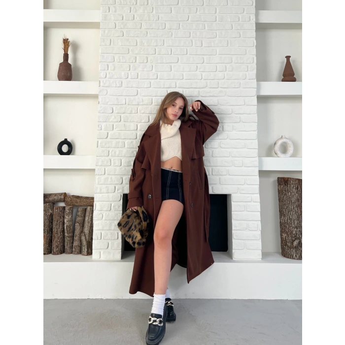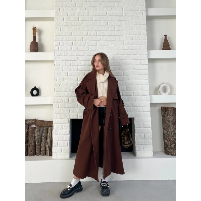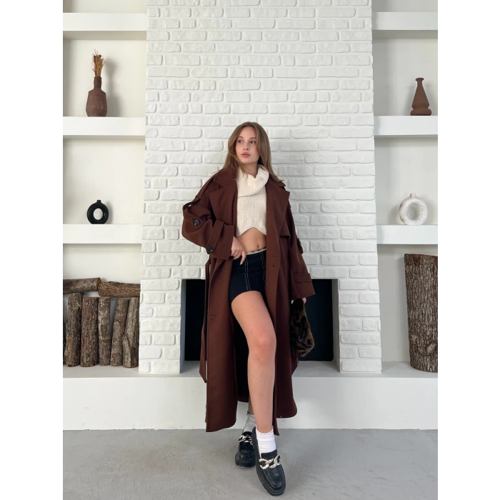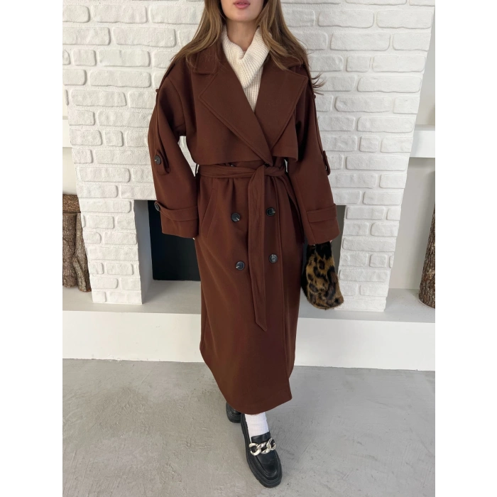 Uzun Boy Kuşak Detaylı Kaban Kahverengi