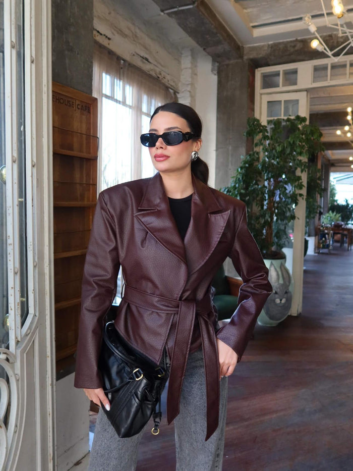 Vatkalı Beli Bağlamalı Deri Ceket