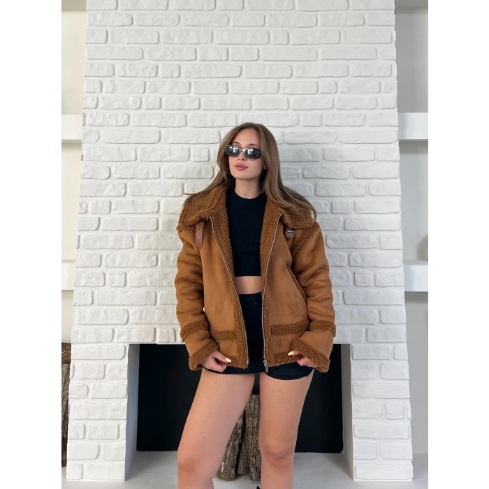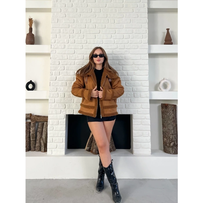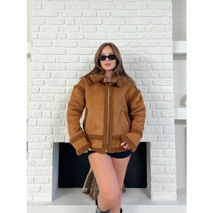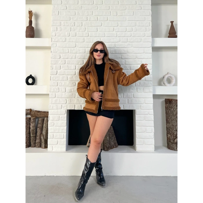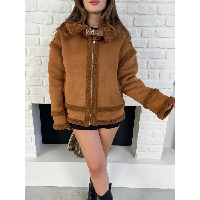 Yaka Kemer Detaylı Lamine Ceket Kahverengi