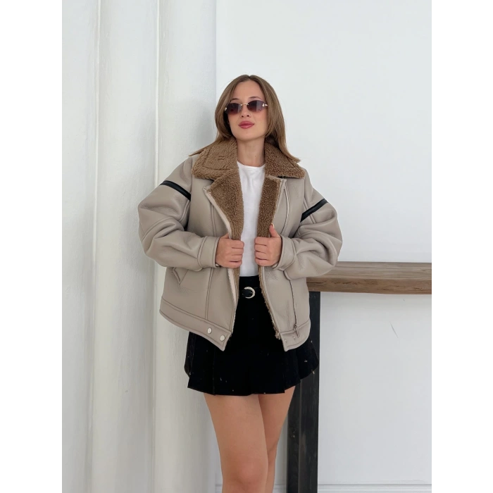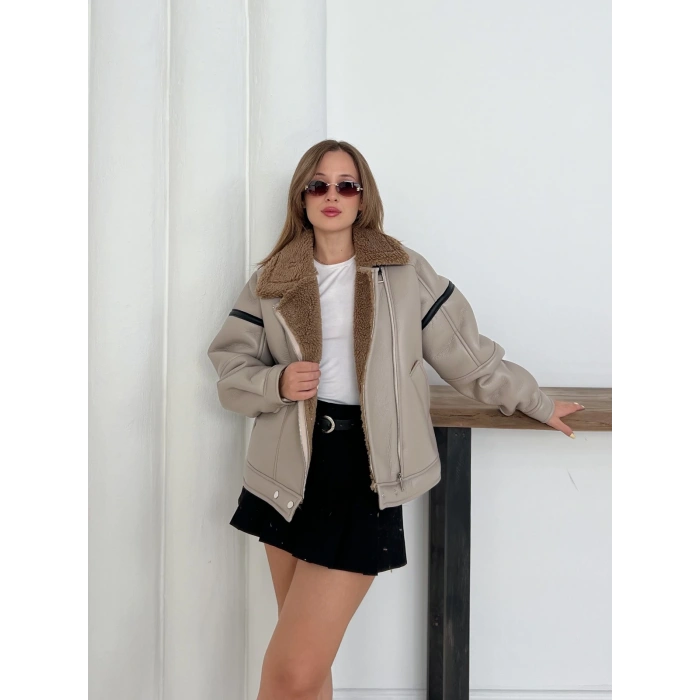 Yaka Peluş Detay Deri Ceket Vizon-Kahve