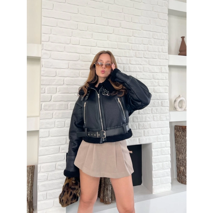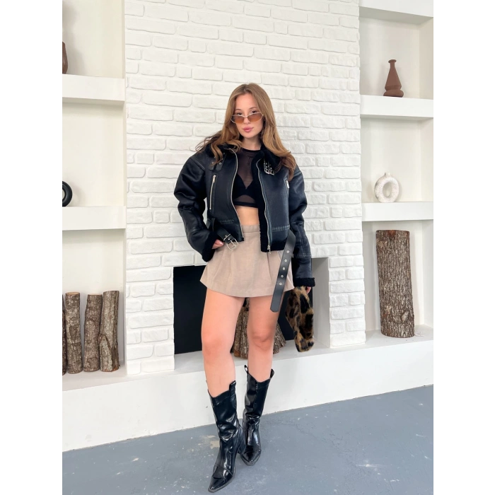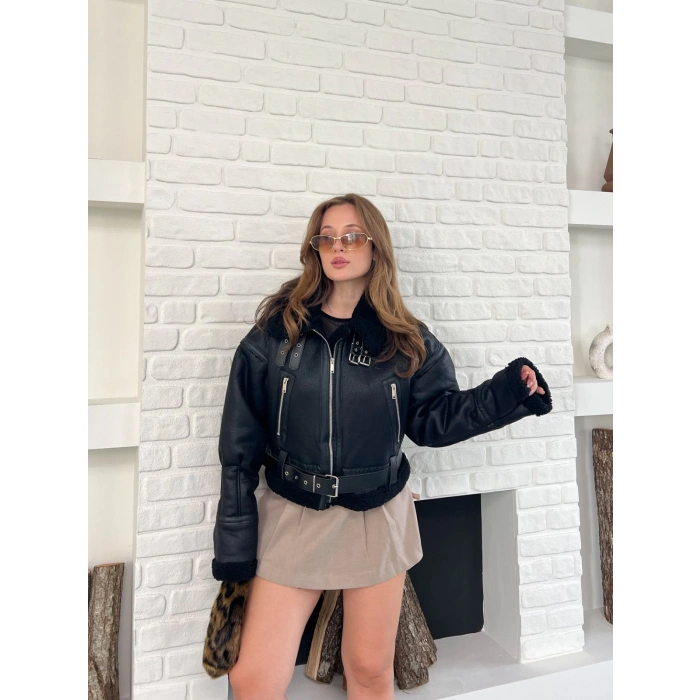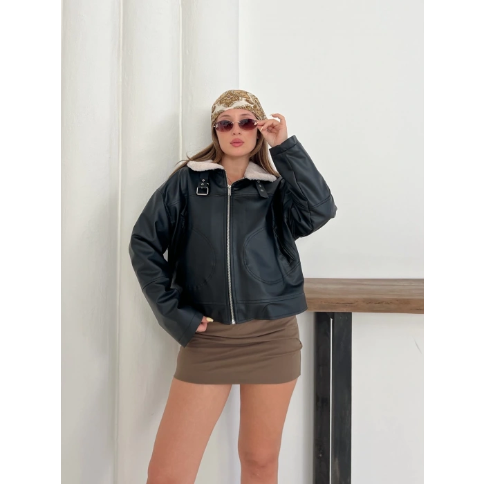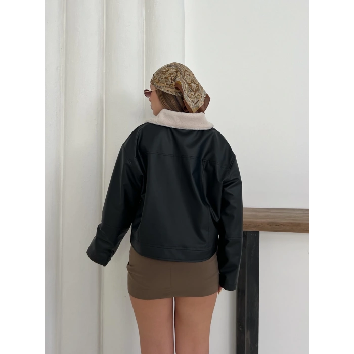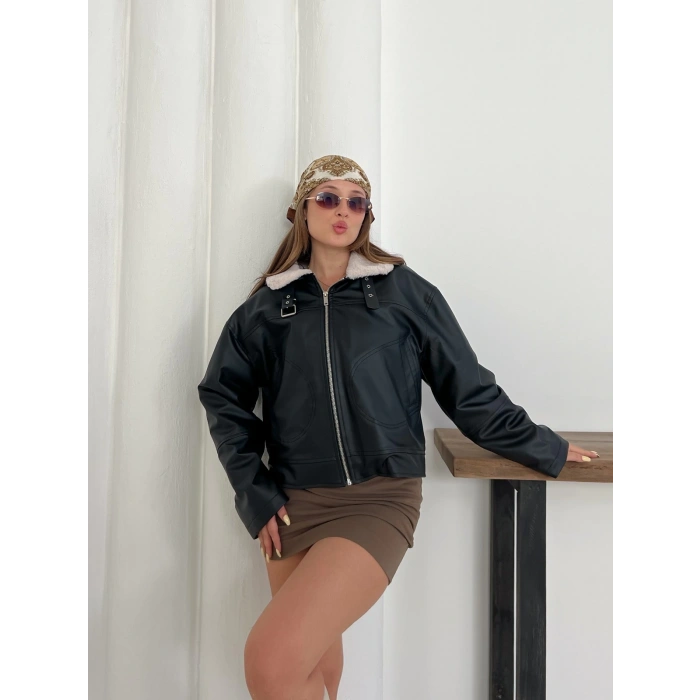 Yaka Peluşlu Fermuarlı Deri Ceket Siyah